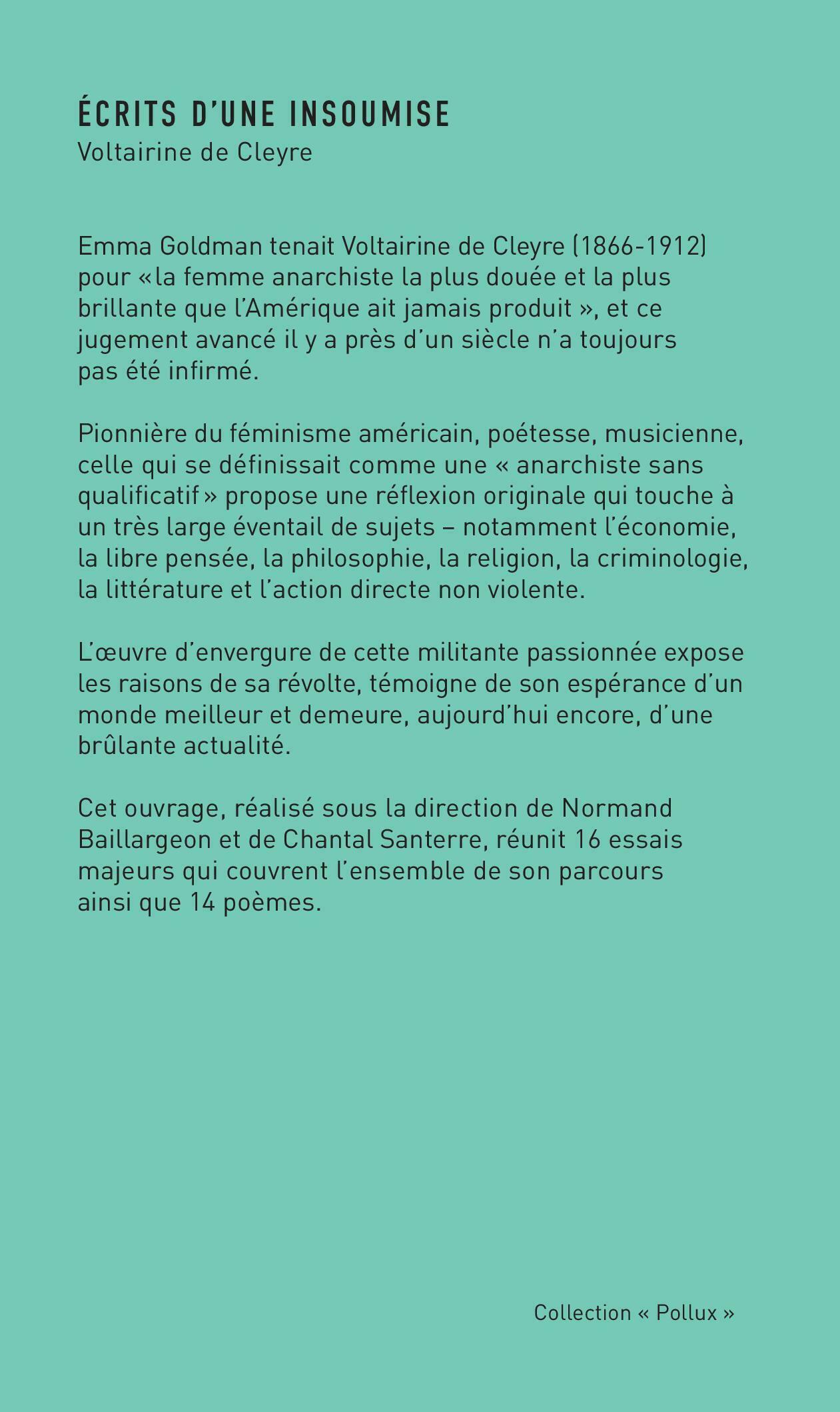 Emma Goldman tenait Voltairine de Cleyre (1866-1912) pour « la femme anarchiste la plus douée et la plus brillante que l’Amérique ait jamais produit », et ce jugement avancé il y a près d’un siècle n’a toujours pas été infirmé.Pionnière du féminisme américain, poétesse, musicienne, celle qui se définissait comme une « anarchiste sans qualificatif » propose une réflexion originale qui touche à un très large éventail de sujets – notamment l’économie, la libre pensée, la philosophie, la religion, la criminologie, la littérature et l’action directe non violente.L’œuvre d’envergure de cette militante passionnée expose les raisons de sa révolte, témoigne de son espérance d’un monde meilleur et demeure, aujourd’hui encore, d’une brûlante actualité.Cet ouvrage, réalisé sous la direction de Normand Baillargeon et de Chantal Santerre, réunit 16 essais majeurs qui couvrent l’ensemble de son parcours ainsi que 14 poèmes.