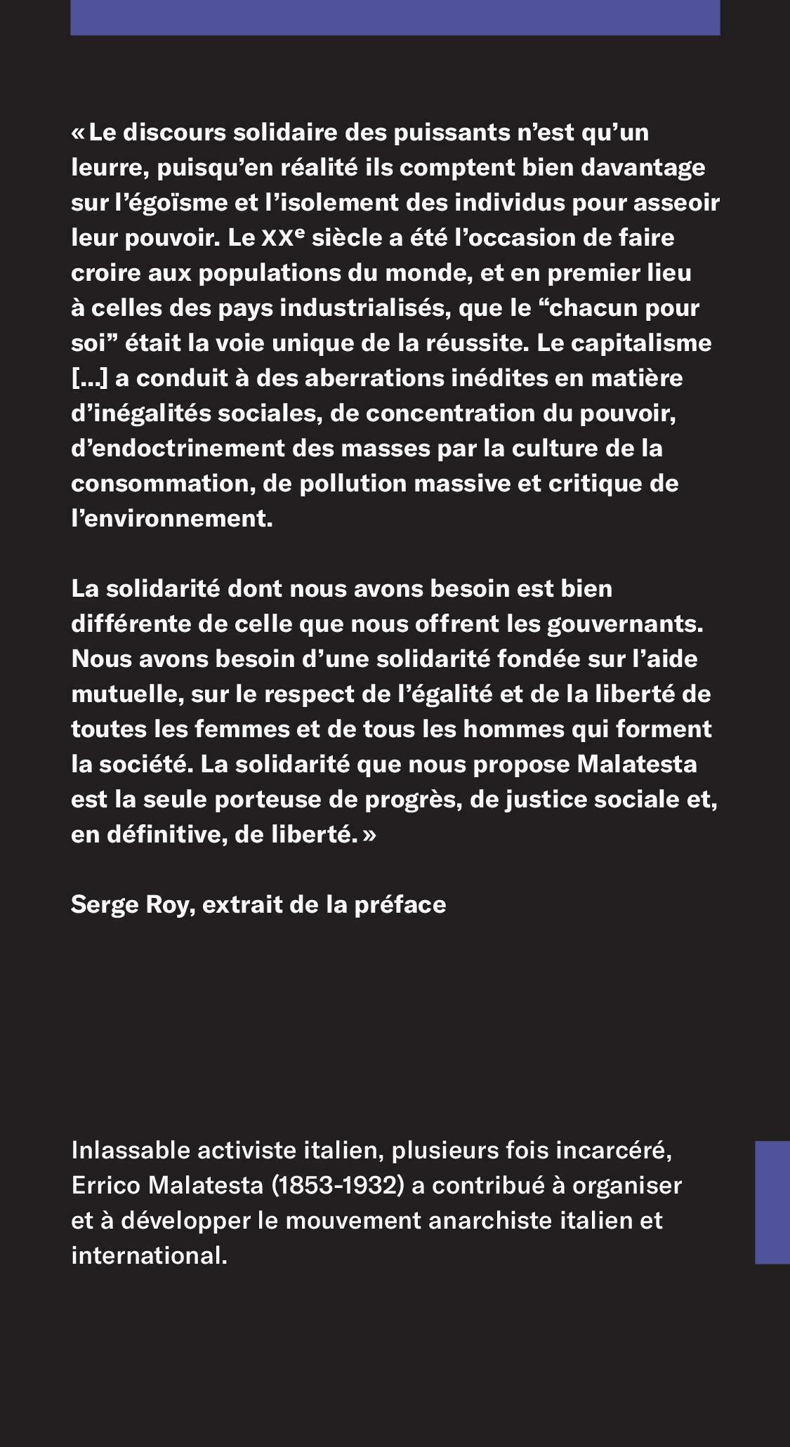 « Le discours solidaire des puissants n’est qu’un leurre, puisqu’en réalité ils comptent bien davantage sur l’égoïsme et l’isolement des individus pour asseoir leur pouvoir. Le xxe siècle a été l’occasion de faire croire aux populations du monde, et en premier lieu à celles des pays industrialisés, que le “chacun pour soi” était la voie unique de la réussite. Le capitalisme […] a conduit à des aberrations inédites en matière d’inégalités sociales, de concentration du pouvoir, d’endoctrinement des masses par la culture de la consommation, de pollution massive et critique de l’environnement.La solidarité dont nous avons besoin est bien différente de celle que nous offrent les gouvernants. Nous avons besoin d’une solidarité fondée sur l’aide mutuelle, sur le respect de l’égalité et de la liberté de toutes les femmes et de tous les hommes qui forment la société. La solidarité que nous propose Malatesta est la seule porteuse de progrès, de justice sociale et, en définitive, de liberté. »Serge Roy, extrait de la préface