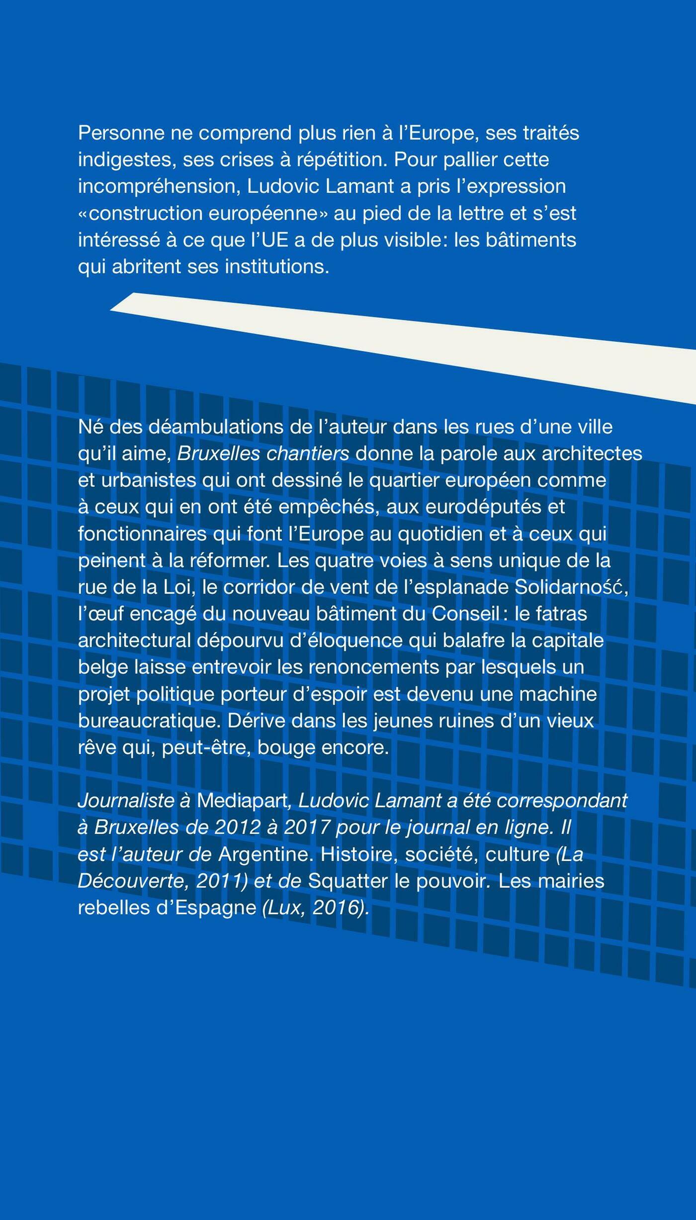 Personne ne comprend plus rien à l’Europe, ses traitésindigestes, ses crises à répétition. Pour pallier cetteincompréhension, Ludovic Lamant a pris l’expression « construction européenne » au pied de la lettre et s’est intéressé à ce que l’UE a de plus visible: les bâtiments qui abritent ses institutions.Né des déambulations de l’auteur dans les rues d’une ville qu’il aime, Bruxelles chantiers donne la parole aux architectes et urbanistes qui ont dessiné le quartier européen comme à ceux qui en ont été empêchés, aux eurodéputés et fonctionnaires qui font l’Europe au quotidien et à ceux qui peinent à la réformer. Les quatre voies à sens unique de la rue de la Loi, le corridor de vent de l’esplanade Solidarność, l’oeuf encagé du nouveau bâtiment du Conseil: le fatras architectural dépourvu d’éloquence qui balafre la capitale belge laisse entrevoir les renoncements par lesquels un projet politique porteur d’espoir est devenu une machine bureaucratique. Dérive dans les jeunes ruines d’un vieux rêve qui, peut-être, bouge encore.