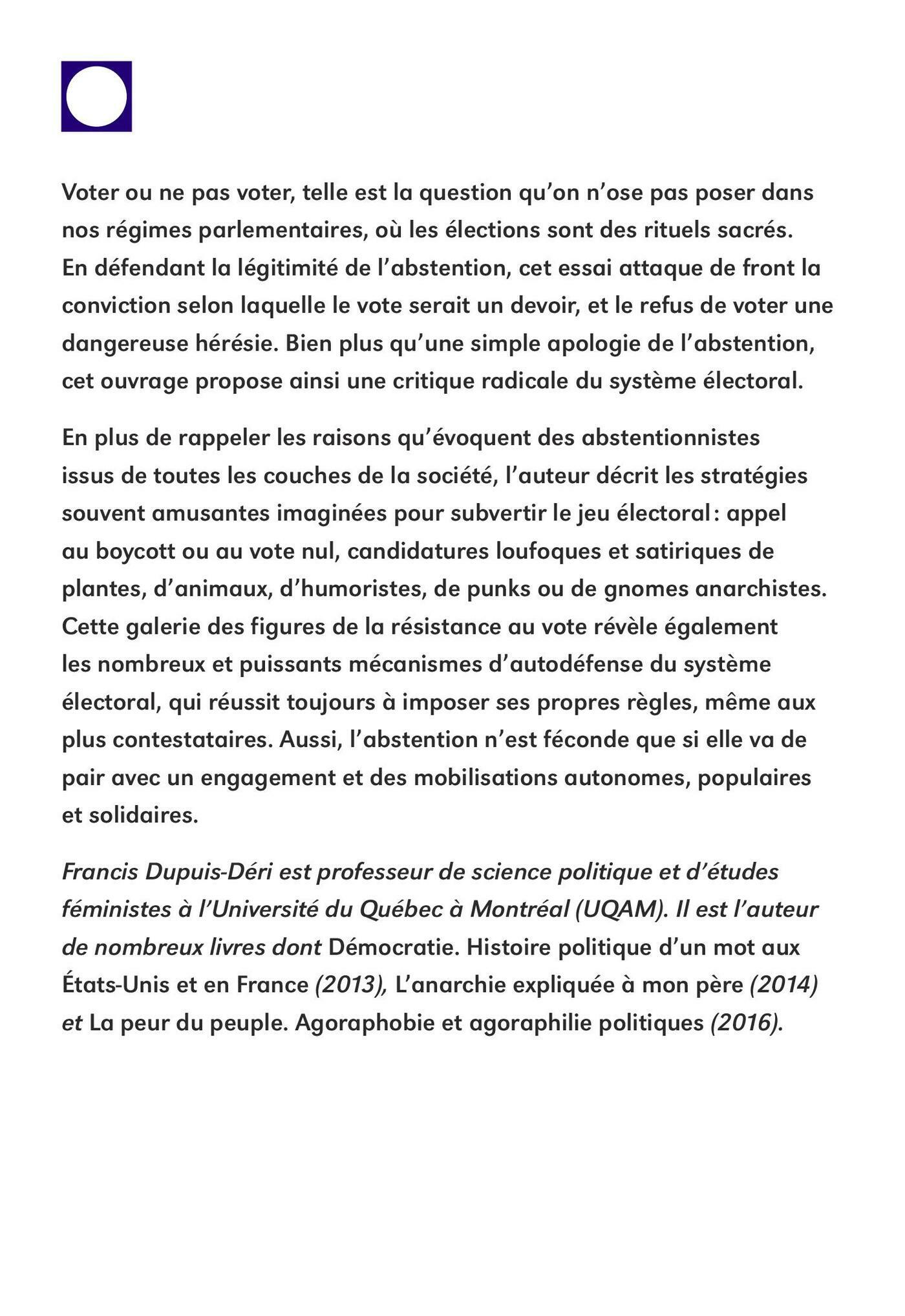 Samuel Archibald, Marie-Sophie Banville, Marie-Claude Beaucage, Adrien Beauduin, Leanne Betasamosake Simpson, Rémy Bourdillon, Guillaume Bourgault-Côté, Simon Brousseau, Véronique Côté, Laurence Côté-Fournier, Marc-André Cyr, Daniel Deslauriers, Nelly Desmarais, Francis Dupuis-Déri, Sarra El Abed, Ralph Elawani, Miriam Fahmy, Geneviève Génier Carrier, Lisa-Marie Gervais, Marianne Giguère, Jean-Herman Guay, Jean-Baptiste Hervé, François Jardon-Gomez, Alexandre L’Archevêque, Jean-François Labonté, Ariane Labrèche, Diane Lamoureux, Sylvain A. Lefèvre, Mark Lemant, Roxane Léouzon, Rosa Luxemburg, Ianik Marcil, Mélanie Martini, Jérémie Mcewen, Frédéric Mérand, William S. Messier, Caroline Monnet, Marianne Niosi, Judith Oliver, Anne-Marie Olivier, Nicolas Paquet, Olivier Paradis-Lemieux, Julia Posca, Marie-Claude Pouliot, Michèle Nicole Provencher, Julie Rijpens, Yvon Rivard, Émélie Rivard-Boudreau, Alice C. Rivera, Jean-Hugues Roy, Clément Sabourin, Nathalie Schneider, Jacinthe Tremblay, Patrick Turmel, Luna Vives