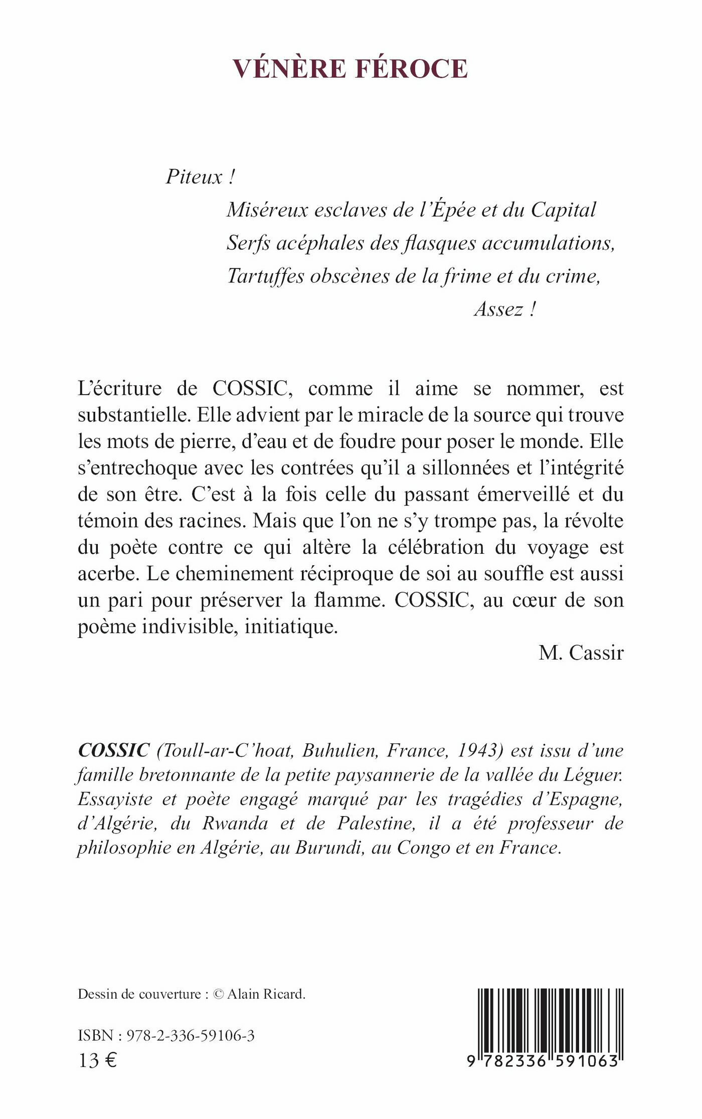 L’écriture de COSSIC, comme il aime se nommer, est substantielle. Elle advient par le miracle de la source qui trouve les mots de pierre, d’eau et de foudre pour poser le monde. Elle s’entrechoque avec les contrées qu’il a sillonnées et l’intégrité de son être. C’est à la fois celle du passant émerveillé et du témoin des racines. Mais que l’on ne s’y trompe pas, la révolte du poète contre ce qui altère la célébration du voyage est acerbe. Le cheminement réciproque de soi au souffle est aussi un pari pour préserver la flamme. COSSIC, au cœur de son poème indivisible, initiatique.