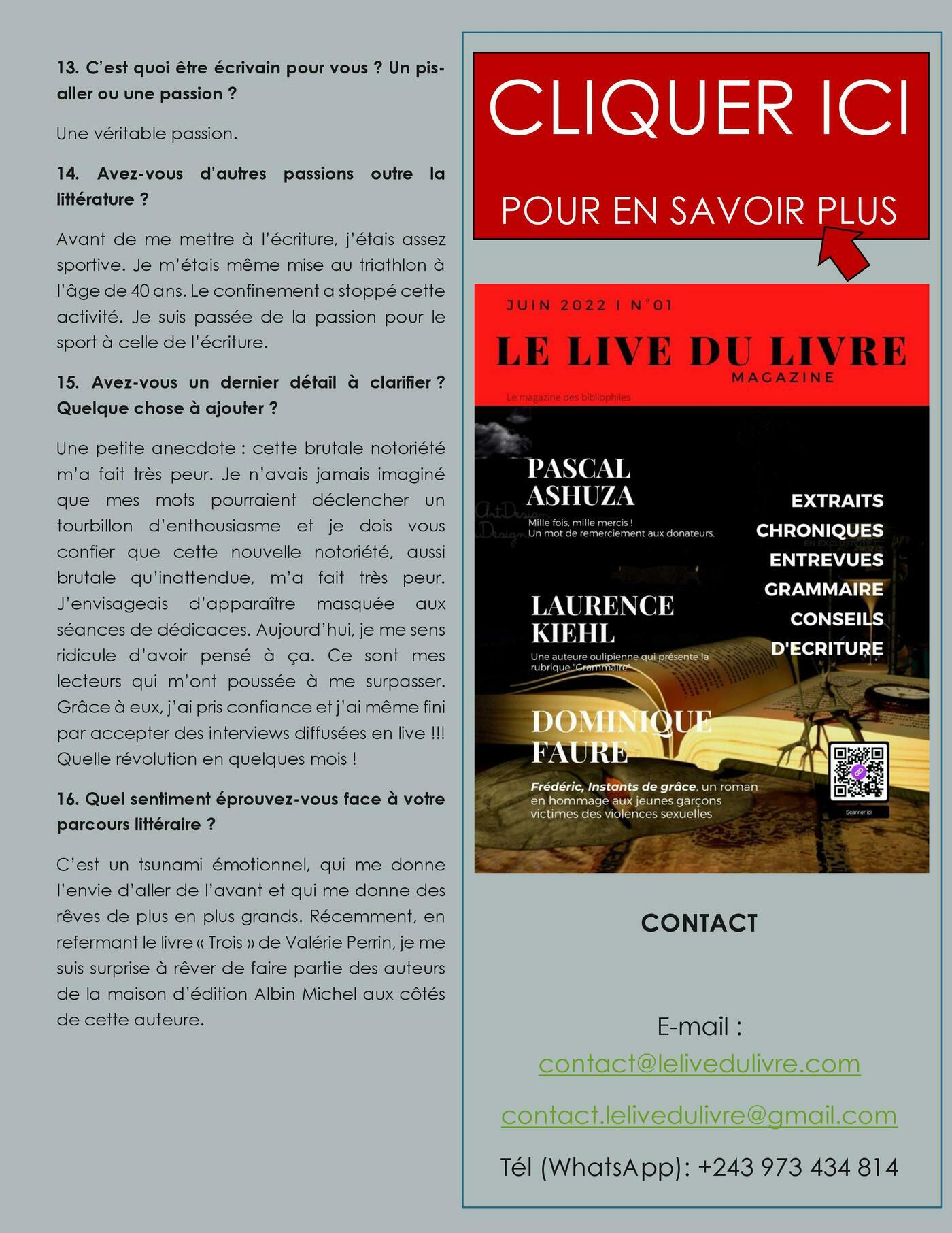 Ce numéro inaugural célèbre la diversité de la littérature francophone à travers des rencontres exclusives et des analyses originales. Découvrez la plume fascinante de Laurence Kiehl, qui vous initie aux contraintes créatives de l’OuLiPo et anime notre nouvelle rubrique dédiée à la grammaire. Explorez des récits poignants avec Dominique Faure et son hommage aux victimes de violences sexuelles, ou laissez-vous emporter par l'univers sombre et captivant de Michel Lecocq, entre photographie et thriller. Ce magazine est un espace de partage où auteurs confirmés et nouveaux talents, comme Vanessa Mathys ou Cynthia Kimberley, dévoilent leurs coulisses de création. Profitez également de nos conseils d’écriture, de chroniques exclusives et d'extraits d'ouvrages pour enrichir votre bibliothèque. Au sommaire : - Dossier spécial : Grammatiké ou aux origines de la grammaire avec Laurence Kiehl. - Entrevues exclusives : Rencontres avec Dominique Faure, Joachim Turin et Michel Lecocq. - Focus auteur : Le parcours de Vanessa Mathys et son roman "Vivante". - Rubriques pratiques : Grammaire, conseils d'écriture et retours de lectures. - Découvertes : Les extraits de Nathan Latrev, Harold J. Benjamin et bien d'autres.
