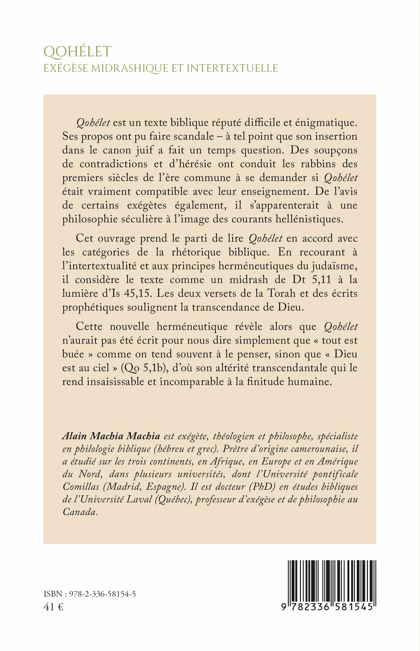 Cet ouvrage prend le parti de lire Qohélet en accord avec les catégories de la rhétorique biblique. En recourant à l’intertextualité et aux principes herméneutiques du judaïsme, il considère le texte comme un midrash de Dt 5,11 à la lumière d’Is 45,15. Les deux versets de la Torah et des écrits prophétiques soulignent la transcendance de Dieu.