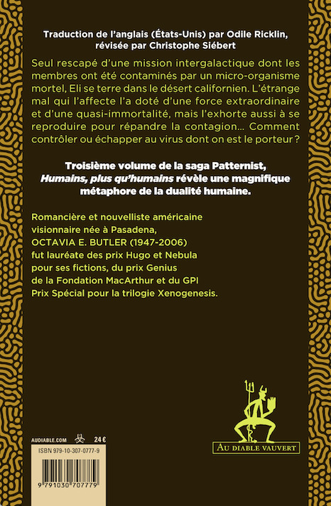 Seul rescapé d'une mission intergalactique dont les membres ont été contaminés par un microorganisme mortel, Eli se terre dans le désert californien. L'étrange mal qui l'affecte l'a doté d'une force extraordinaire et d'une quasiimmortalité, mais l'exhorte aussi à se reproduire pour répandre la contagion. Comment contrôler ou échapper au virus dont on est le porteur ? Troisième volume de la saga Patternist, Humains, plus qu'humains révèle une magnifique métaphore de la dualité humaine. Romancière et nouvelliste américaine visionnaire née à Pasadena, Octavia E. Butler (19472006) fut lauréate des prix Hugo et Nebula pour ses fictions, du prix Genius de la Fondation MacArthur et du GPI Prix Spécial pour la trilogie Xenogenesis.