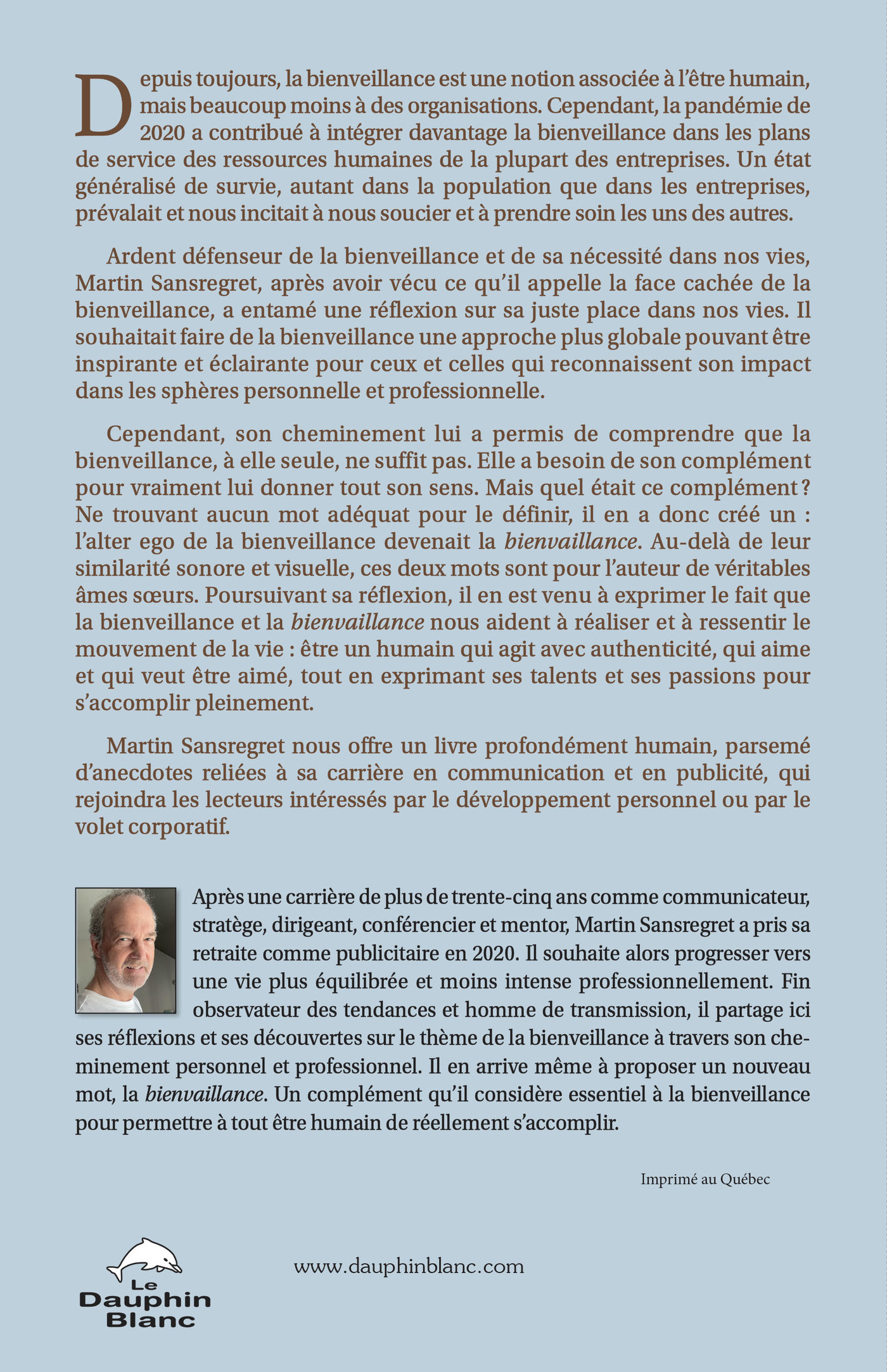 Depuis toujours, la bienveillance est une notion associée à l’être humain, mais beaucoup moins à des organisations. Cependant, la pandémie de 2020 a contribué à intégrer la bienveillance au cœur des plans de service des ressources humaines de la plupart des entreprises. Un état généralisé de survie, autant dans la population que dans les entreprises, prévalait et nous incitait à nous soucier et à prendre soin les uns des autres.Ardent défenseur de la bienveillance et de sa nécessité dans nos vies, Martin Sansregret a entamé une réflexion sur sa juste place dans nos vies. Il souhaitait faire de la bienveillance une approche plus globale pouvant être inspirante et éclairante pour ceux et celles reconnaissant son importance et son impact dans les sphères personnelle et professionnelle. Cependant, son cheminement lui a permis de comprendre que la bienveillance, à elle seule, ne suffit pas. Elle a besoin de son complément pour vraiment lui donner tout son sens. Mais quel était ce complément? Ne trouvant aucun mot adéquat pour le définir, il en a donc créer un : l’alter ego de la bienveillance devenait la bienvaillance. Au-delà de leur similarité sonore et visuelle, ces deux mots sont pour l’auteur de véritables âmes sœurs. Poursuivant sa réflexion, il en est venu à exprimer le fait que la bienveillance et la bienvaillance nous aident à réaliser et à ressentir le mouvement de la vie: être un humain qui agit avec authenticité, qui aime et qui veut être aimé, tout en exprimant ses talents et ses passions pour s’accomplir pleinement.Martin Sansregret nous offre un livre profondément humain, parsemé d’anecdotes reliées à sa carrière en communication et en publicité, qui rejoindra les lecteurs intéressés par le développement personnel ou par le volet corporatif.L'auteur : Après une carrière de plus de trente-cinq ans comme communicateur, stratège, dirigeant, conférencier et mentor, Martin Sansregret a pris sa retraite comme publicitaire en 2020. Il souhaite alors progresser vers une vie plus équilibrée et moins intense professionnellement. Fin observateur des tendances et homme de transmission, il partage ici ses réflexions et ses découvertes sur le thème de la bienveillance à travers son cheminement personnel et professionnel. Il en arrive même à proposer un nouveau mot, la bienvaillance. Un complément qu’il considère essentiel à la bienveillance pour permettre à tout être humain de réellement s’accomplir.