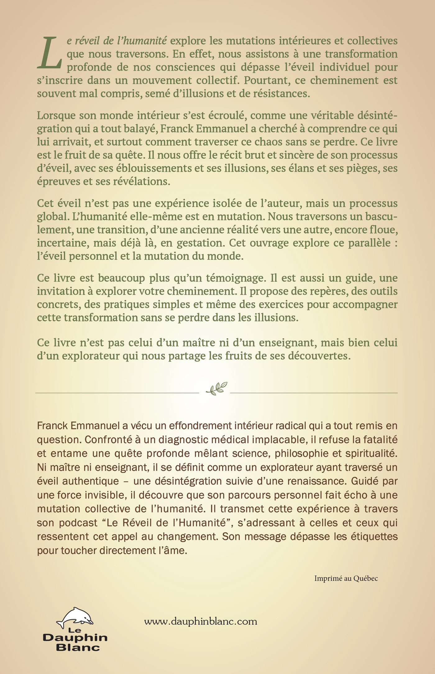 Le réveil de l’humanité explore les mutations intérieures et collectives que nous traversons. En effet, nous assistons à une transformation profonde de nos consciences qui dépasse l’éveil individuel pour s’inscrire dans un mouvement collectif. Pourtant, ce cheminement est souvent mal compris, semé d’illusions et de résistances.Lorsque son monde intérieur s’est écroulé, comme une véritable désintégration qui a tout balayé, Franck Emmanuel a cherché à comprendre ce qui lui arrivait, et surtout comment traverser ce chaos sans se perdre. Ce livre est le fruit de sa quête. Il nous offre le récit brut et sincère de son processus d’éveil, avec ses éblouissements et ses illusions, ses élans et ses pièges, ses épreuves et ses révélations. Cet éveil n’est pas une expérience isolée de l’auteur, mais un processus global. L’humanité elle-même est en mutation. Nous traversons un basculement, une transition, d’une ancienne réalité vers une autre, encore floue, incertaine, mais déjà là, en gestation. Cet ouvrage explore ce parallèle: l’éveil personnel et la mutation du monde. Ce livre est beaucoup plus qu’un témoignage. Il est aussi un guide, une invitation à explorer votre cheminement. Il propose des repères, des outils concrets, des pratiques simples et même des exercices pour accompagner cette transformation sans se perdre dans les illusions.Ce livre n’est pas celui d’un maître ni d’un enseignant, mais bien celui d’un explorateur qui nous partage les fruits de ses découvertes.L'auteur :Franck Emmanuel a vécu un effondrement intérieur radical qui a tout remis en question. Confronté à un diagnostic médical implacable, il refuse la fatalité et entame une quête profonde mêlant science, philosophie et spiritualité. Ni maître ni enseignant, il se définit comme un explorateur ayant traversé un éveil authentique - une désintégration suivie d’une renaissance. Guidé par une force invisible, il découvre que son parcours personnel fait écho à une mutation collective de l’humanité. Il transmet cette expérience à travers son podcast «Le Réveil de l’Humanité», s’adressant à celles et ceux qui ressentent cet appel au changement. Son message dépasse les étiquettes pour toucher directement l’âme.