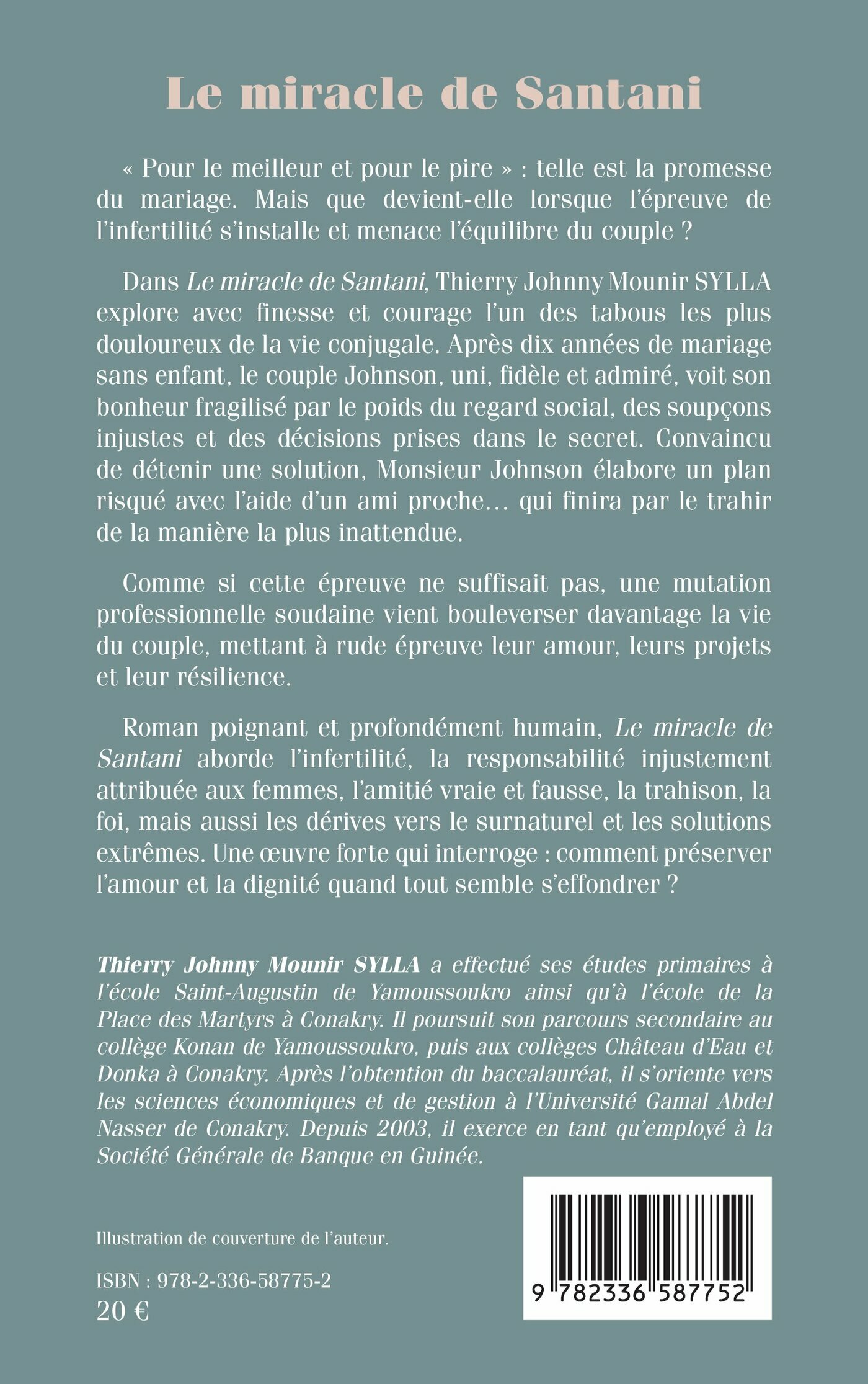Dans Le miracle de Santani, Thierry Johnny Mounir SYLLA explore avec finesse et courage l’un des tabous les plus douloureux de la vie conjugale. Après dix années de mariage sans enfant, le couple Johnson, uni, fidèle et admiré, voit son bonheur fragilisé par le poids du regard social, des soupçons injustes et des décisions prises dans le secret. Convaincu de détenir une solution, Monsieur Johnson élabore un plan risqué avec l’aide d’un ami proche… qui finira par le trahir de la manière la plus inattendue.
