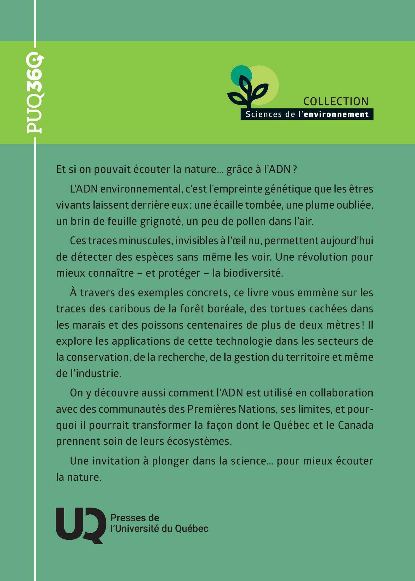 Et si on pouvait écouter la nature… grâce à l’ADN ?L’ADN environnemental, c’est l’empreinte génétique que les êtres vivants laissent derrière eux : une écaille tombée, une plume oubliée, un brin de feuille grignoté, un peu de pollen dans l’air.Ces traces minuscules, invisibles à l’œil nu, permettent aujourd’hui de détecter des espèces sans même les voir. Une révolution pour mieux connaître – et protéger – la biodiversité.À travers des exemples concrets, ce livre vous emmène sur les traces des caribous de la forêt boréale, des tortues cachées dans les marais et des poissons centenaires de plus de deux mètres ! Il explore les applications de cette technologie dans les secteurs de la conservation, de la recherche, de la gestion du territoire et même de l’industrie.On y découvre aussi comment l’ADN est utilisé en collaboration avec des communautés des Premières Nations, ses limites, et pourquoi il pourrait transformer la façon dont le Québec et le Canada prennent soin de leurs écosystèmes.Une invitation à plonger dans la science… pour mieux écouter la nature.