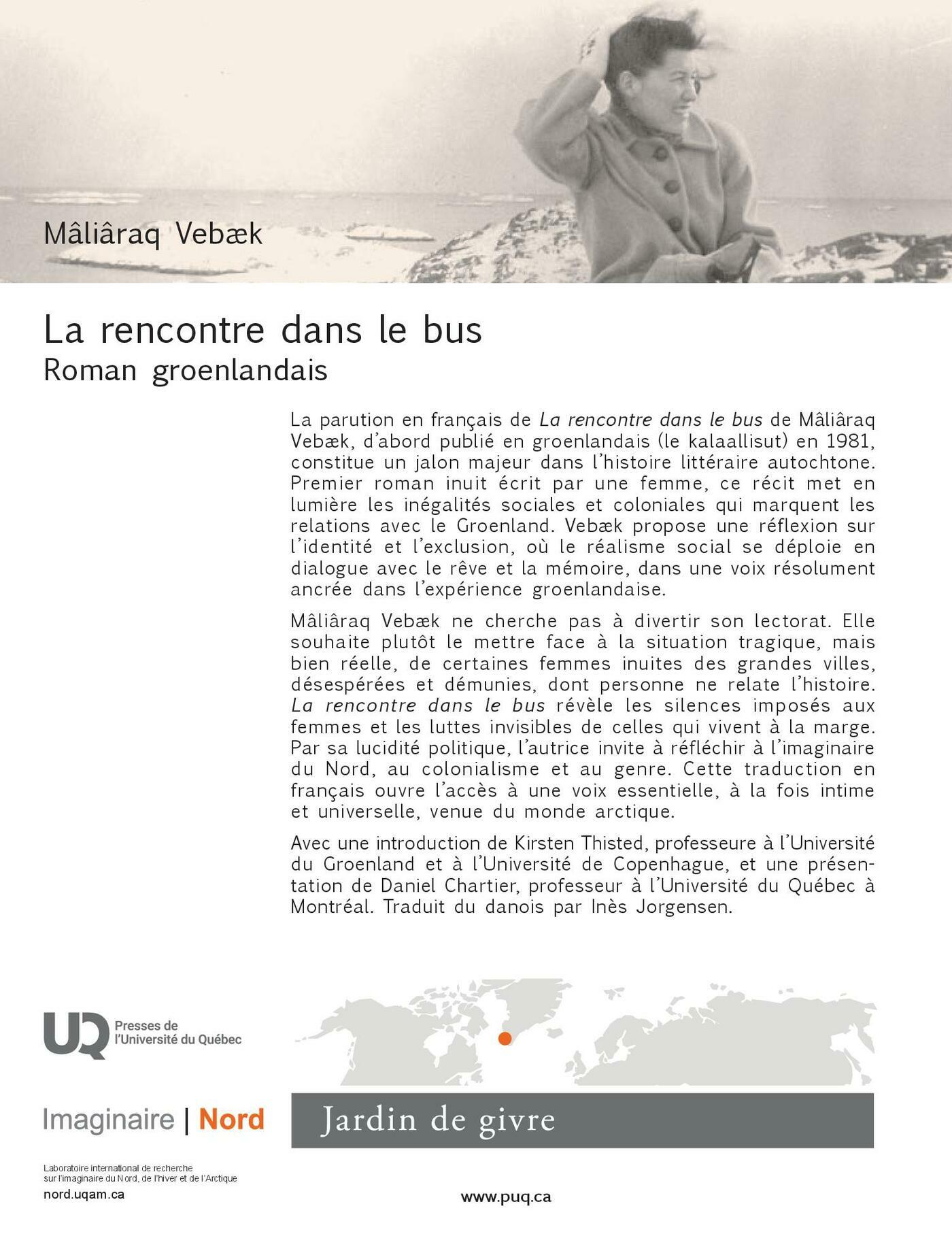 La parution en français de La rencontre dans le bus de Mâliâraq Vebæk, d’abord publié en groenlandais (le kalaallisut) en 1981, constitue un jalon majeur dans l’histoire littéraire autochtone. Premier roman inuit écrit par une femme, ce récit met en lumière les inégalités sociales et coloniales qui marquent les relations avec le Groenland. Vebæk propose une réflexion sur l’identité et l’exclusion, où le réalisme social se déploie en dialogue avec le rêve et la mémoire, dans une voix résolument ancrée dans l’expérience groenlandaise.Mâliâraq Vebæk ne cherche pas à divertir son lectorat. Elle souhaite plutôt le mettre face à la situation tragique, mais bien réelle, de certaines femmes inuites des grandes villes, désespérées et démunies, dont personne ne relate l’histoire. La rencontre dans le bus révèle les silences imposés aux femmes et les luttes invisibles de celles qui vivent à la marge. Par sa lucidité politique, l’autrice invite à réfléchir à l’imaginaire du Nord, au colonialisme et au genre. Cette traduction en français ouvre l’accès à une voix essentielle, à la fois intime et universelle, venue du monde arctique.Avec une introduction de Kirsten Thisted, professeure à l’Université du Groenland et à l’Université de Copenhague, et une présentation de Daniel Chartier, professeur à l’Université du Québec à Montréal. Traduit du danois par Inès Jorgensen.