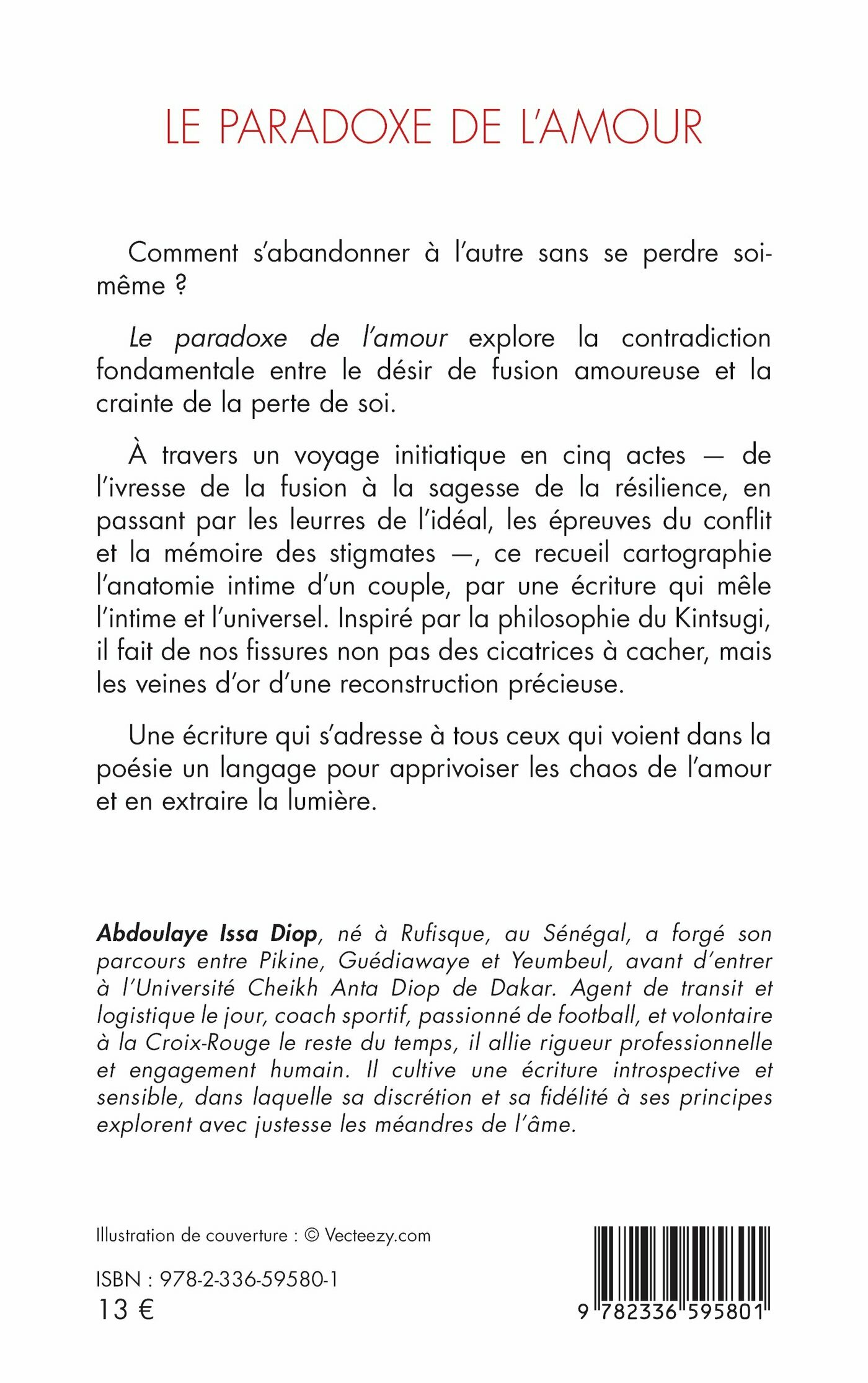 À travers un voyage initiatique en cinq actes — de l’ivresse de la fusion à la sagesse de la résilience, en passant par les leurres de l’idéal, les épreuves du conflit et la mémoire des stigmates —, ce recueil cartographie l’anatomie intime d’un couple, par une écriture qui mêle l’intime et l’universel. Inspiré par la philosophie du Kintsugi, il fait de nos fissures non pas des cicatrices à cacher, mais