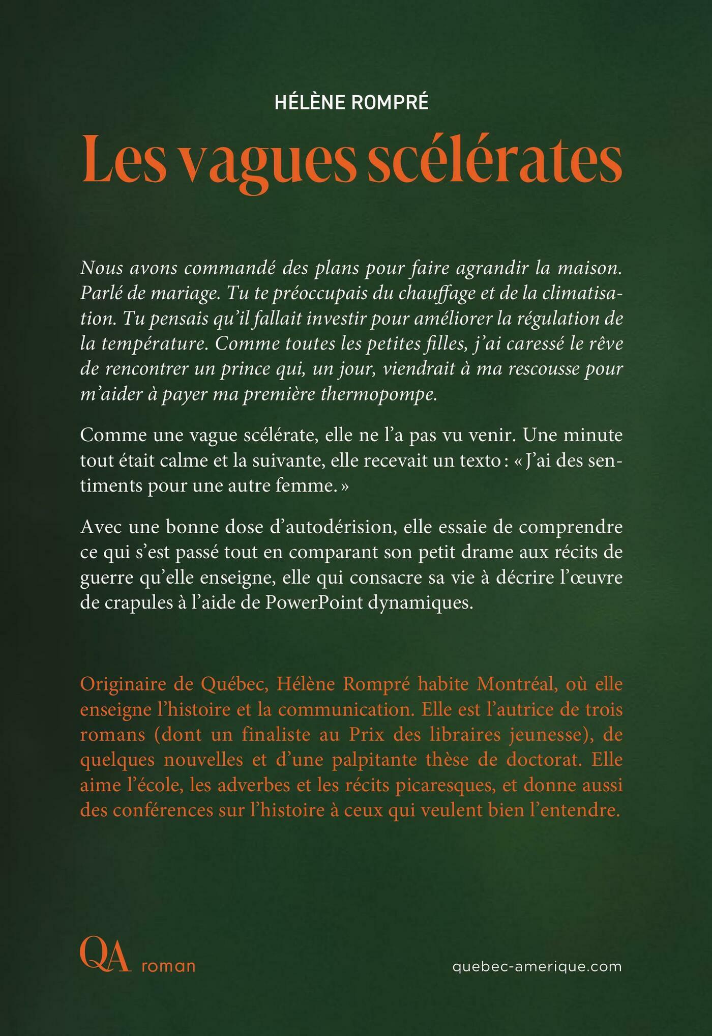 Nous avons commandé des plans pour faire agrandir la maison. Parlé de mariage. Tu te préoccupais du chauffage et de la climatisation. Tu pensais qu’il fallait investir pour améliorer la régulation de la température. Comme toutes les petites filles, j’ai caressé le rêve de rencontrer un prince qui, un jour, viendrait à ma rescousse pour m’aider à payer ma première thermopompe.Comme une vague scélérate, elle ne l’a pas vu venir. Une minute tout était calme et la suivante, elle recevait un texto : « J’ai des sentiments pour une autre femme. »Avec une bonne dose d’autodérision, elle essaie de comprendre ce qui s’est passé tout en comparant son petit drame aux récits de guerre qu’elle enseigne, elle qui consacre sa vie à décrire l’œuvre de crapules à l’aide de PowerPoint dynamiques.