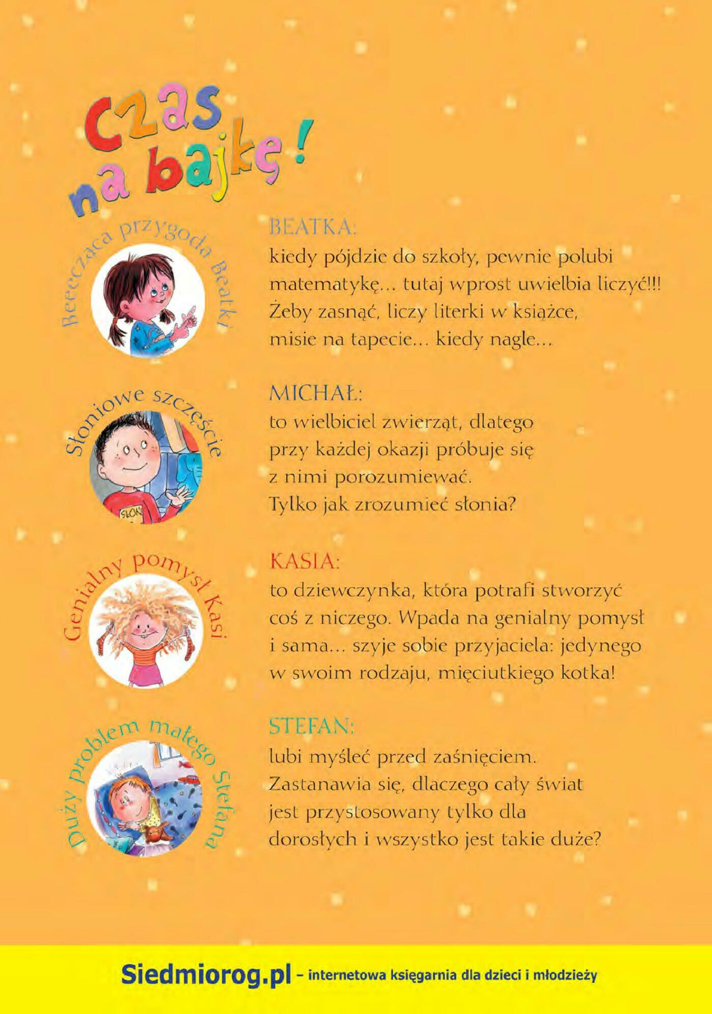 BEATKA: kiedy pójdzie do szkoły, pewnie polubi matematykę. Tutaj wprost uwielbia liczyć!!! Żeby zasnąć, liczy literki w książce, misie na tapecie... Kiedy nagle…MICHAŁ: to wielbiciel zwierząt, dlatego przy każdej okazji próbuje się z nimi porozumiewać. Tylko jak zrozumieć słonia?KASIA: to dziewczynka, która potrafi stworzyć coś z niczego. Wpada na genialny pomysł i sama szyje sobie przyjaciela: jedynego w swoim rodzaju, mięciutkiego kotka!STEFAN: lubi myśleć przed zaśnięciem. Zastanawia się, dlaczego cały świat jest przystosowany tylko dla dorosłych i wszystko jest takie duże?