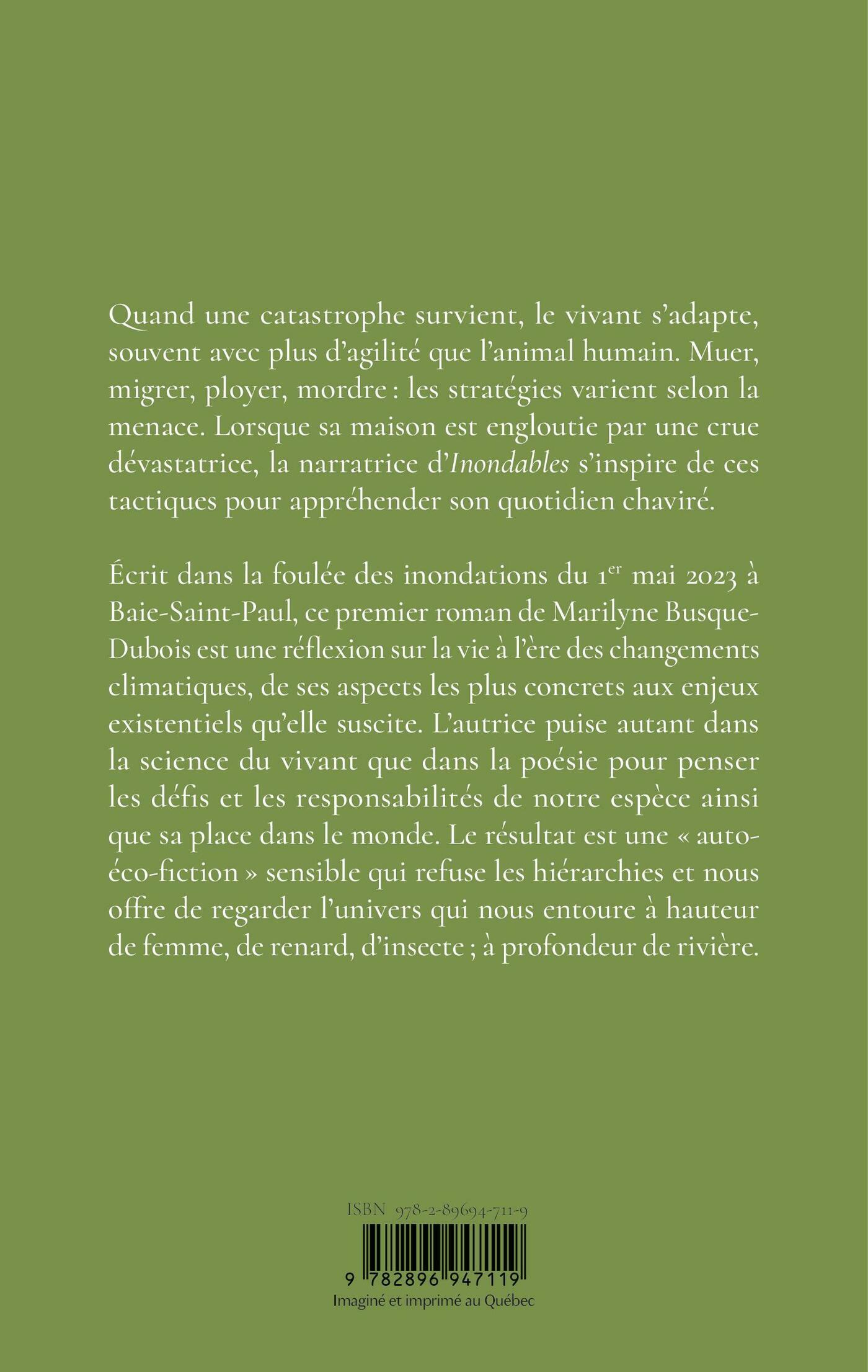 Quand une catastrophe survient, le vivant s’adapte, souvent avec plus d’agilité que l’animal humain. Muer, migrer, ployer, mordre : les stratégies varient selon la menace. Lorsque sa maison est engloutie par une crue dévastatrice, la narratrice d’Inondables s’inspire de ces tactiques pour appréhender son quotidien chaviré.Écrit dans la foulée des inondations du 1er mai 2023 à Baie-Saint-Paul, ce premier roman de Marilyne Busque-Dubois est une réflexion sur la vie à l’ère des changements climatiques, de ses aspects les plus concrets aux enjeux existentiels qu’elle suscite. L’autrice puise autant dans la science du vivant que dans la poésie pour penser les défis et les responsabilités de notre espèce ainsi que sa place dans le monde. Le résultat est une « auto-éco-fiction » sensible qui refuse les hiérarchies et nous offre de regarder l’univers qui nous entoure à hauteur de femme, de renard, d’insecte ; à profondeur de rivière.