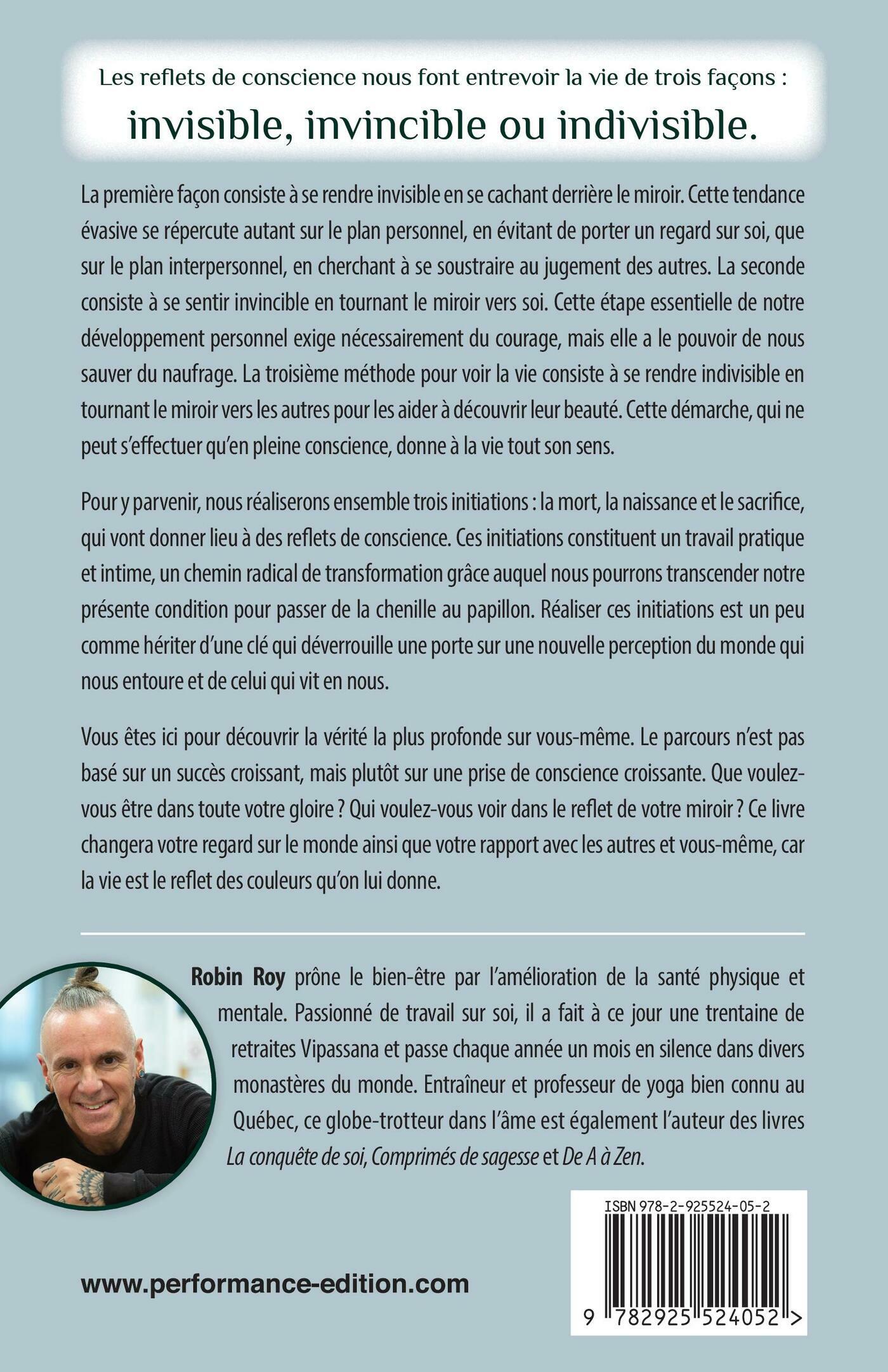 La première façon consiste à se rendre invisible en se cachant derrière le miroir. Cette tendance évasive se répercute autant sur le plan personnel, en évitant de porter un regard sur soi, que sur le plan interpersonnel, en cherchant à se soustraire au jugement des autres. La seconde consiste à se sentir invincible en tournant le miroir vers soi. Cette étape essentielle de notre développement personnel exige nécessairement du courage, mais elle a le pouvoir de nous sauver du naufrage. La troisième méthode pour voir la vie consiste à se rendre indivisible en tournant le miroir vers les autres pour les aider à découvrir leur beauté. Cette démarche, qui ne peut s’effectuer qu’en pleine conscience, donne à la vie tout son sens.Pour y parvenir, nous réaliserons ensemble trois initiations : la mort, la naissance et le sacrifice, qui vont donner lieu à des reflets de conscience. Ces initiations constituent un travail pratique et intime, un chemin radical de transformation grâce auquel nous pourrons transcender notre présente condition pour passer de la chenille au papillon. Réaliser ces initiations est un peu comme hériter d’une clé qui déverrouille une porte sur une nouvelle perception du monde qui nous entoure et de celui qui vit en nous. Vous êtes ici pour découvrir la vérité la plus profonde sur vous-même. Le parcours n’est pas basé sur un succès croissant, mais plutôt sur une prise de conscience croissante. Que voulez-vous être dans toute votre gloire? Qui voulez-vous voir dans le reflet de votre miroir? Ce livre changera votre regard sur le monde ainsi que votre rapport avec les autres et vous-même, car la vie est le reflet des couleurs qu’on lui donne.