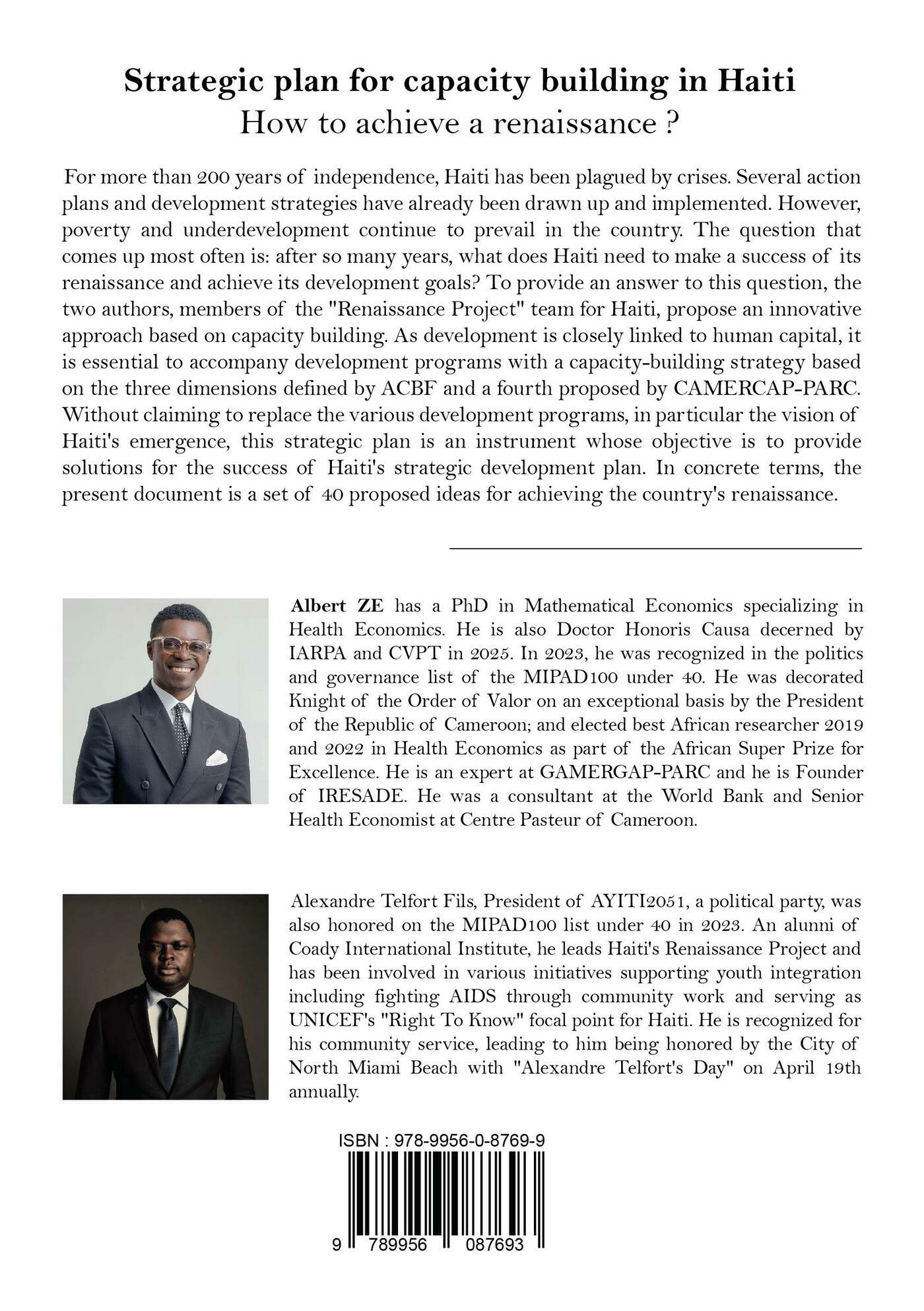 For more than 200 years of independence, Haiti has been plagued by crises. Several action plans and development strategies have already been drawn up and implemented. However, poverty and underdevelopment continue to prevail in the country. The question that comes up most often is: after so many years, what does Haiti need to make a success of its renaissance and achieve its development goals? To provide an answer to this question, the two authors, members of the "Renaissance Project" team for Haiti, propose an innovative approach based on capacity building. As development is closely linked to human capital, it is essential to accompany development programs with a capacity-building strategy based on the three dimensions defined by ACBF and a fourth proposed by CAMERCAP-PARC. Without claiming to replace the various development programs, in particular the vision of Haiti's emergence, this strategic plan is an instrument whose objective is to provide solutions for the success of Haiti's strategic development plan. In concrete terms, the present document is a set of 40 proposed ideas for achieving the country's renaissance.Book distributed by Alchimist Publishing.