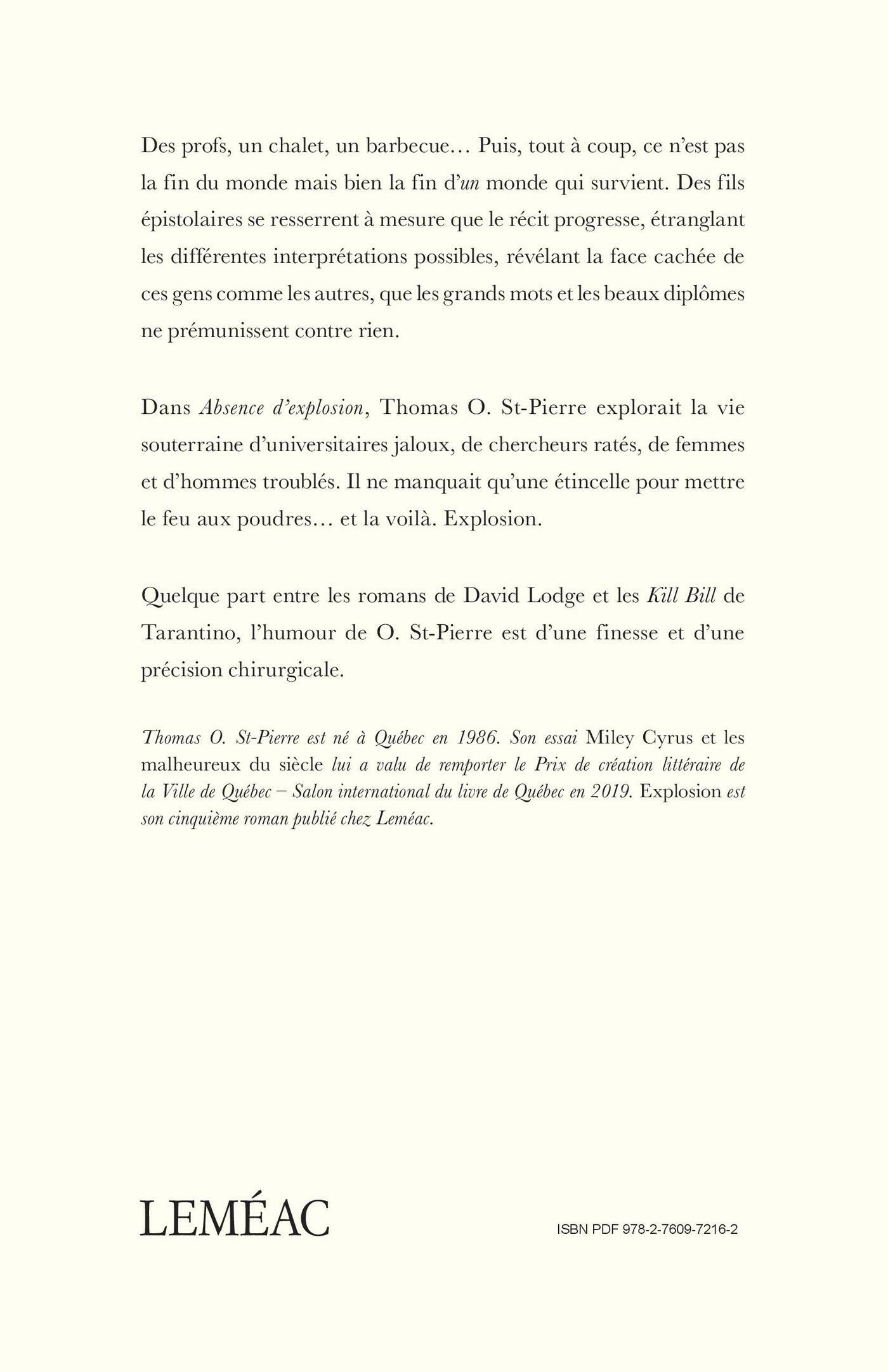 Des profs, un chalet, un barbecue… Puis, tout à coup, ce n’est pas la fin du monde mais bien la fin d’un monde qui survient. Des fils épistolaires se resserrent à mesure que le récit progresse, étranglant les différentes interprétations possibles, révélant la face cachée de ces gens comme les autres, que les grands mots et les beaux diplômes ne prémunissent contre rien.Dans ABSENCE D'EXPLOSION, Thomas O. St-Pierre explorait la vie souterraine d’universitaires jaloux, de chercheurs ratés, de femmes et d’hommes troublés. Il ne manquait qu’une étincelle pour mettre le feu aux poudres… et la voilà. Explosion.Quelque part entre les romans de David Lodge et les Kill Bill de Tarantino, l’humour de O. St-Pierre est d’une finesse et d’une précision chirurgicale.