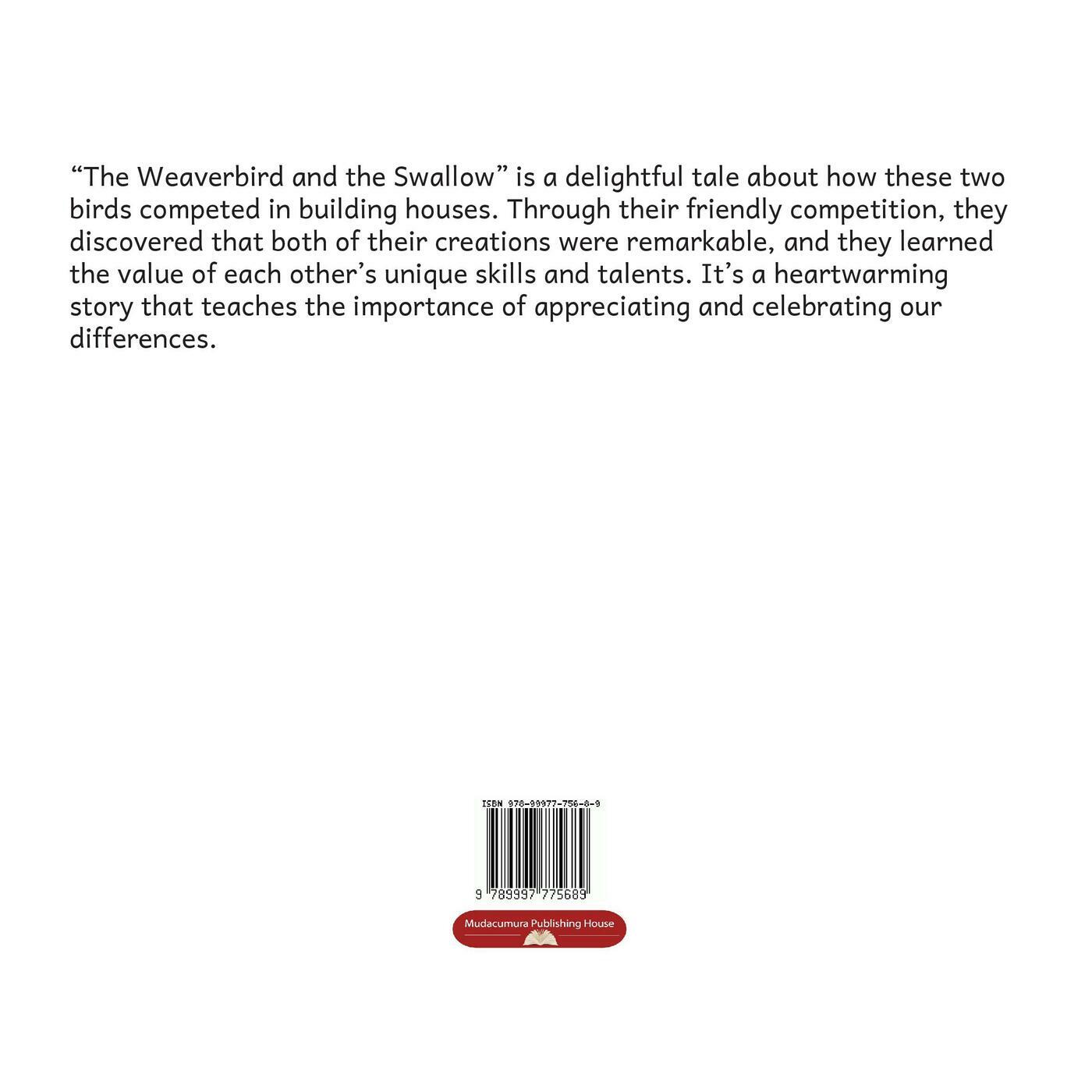 The Weaverbird and the Swallow is a charming and thoughtful fable about pride, creativity, and the beauty of difference. When the confident weaverbird boasts that he is the better singer and the swift swallow insists she is faster, a wise tortoise encourages them to compete fairly—on the same task. The two birds decide to build houses, each using their own skills and preferred materials. The swallow carefully shapes her nest from smooth mud, while the weaverbird intricately weaves a large, impressive nest from dry grasses.Curious and patient, the tortoise is invited to judge their work. To the surprise of both birds, he praises each house for its uniqueness and tells them that they are both the best—unless they wish to be second. This gentle verdict helps the birds reflect on their abilities and appreciate one another.As they go on to find food—rice for the swallow and sorghum for the weaver—they return happily to their homes, realizing that their different talents make them stronger together. The story ends with friendship, collaboration, and harmony, teaching young readers the value of respect, cooperation, and celebrating diversity rather than competing for superiority.