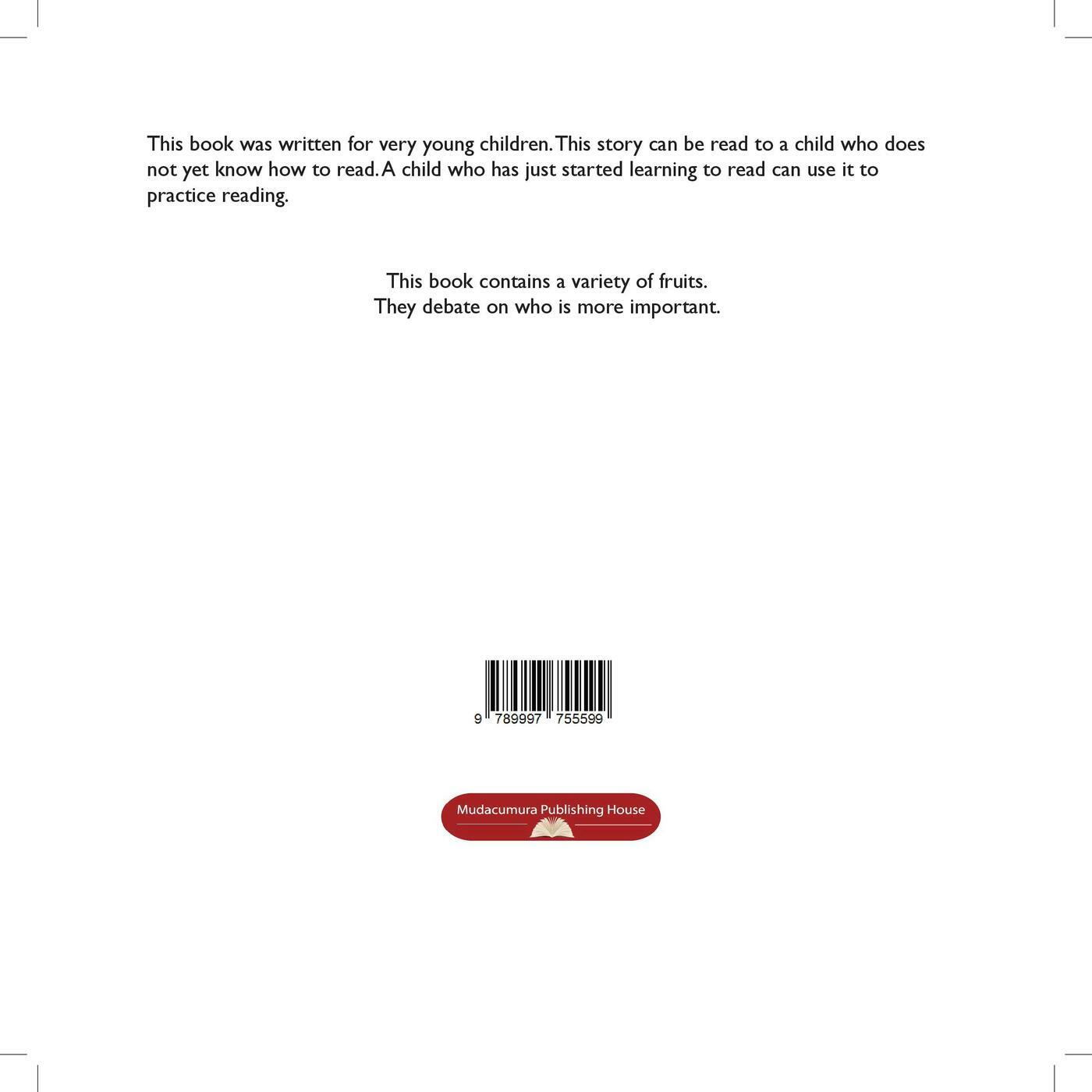 In the beautiful Garden of Mbuto, all the fruits live together in harmony—until one day, pride sparks a lively debate. Each fruit begins to boast about its importance, arguing that it is more valuable than the others. Orange claims to be the greatest because its sweet juice is loved by everyone. Lemon counters that its bitter juice is powerful, used for medicine and skin care. Papaya speaks of how it helps babies with digestion, while Mango insists it is essential for school children because it fights hunger. Banana proudly declares that it is loved by all ages.Soon, Passion fruit, Tamarillo, Pineapple, Berries, Grapes, and even Sugarcane join the discussion, each highlighting their unique benefits. The garden grows noisy with competing voices—until the wise Vine, the king of the garden, gently listens and offers a thoughtful conclusion. Rather than choosing a winner, the Vine reminds them that their true strength lies in working together, complementing one another, and celebrating their differences.Through colorful characters and playful dialogue, this story teaches young children about respect, cooperation, and the value of diversity. It encourages readers to appreciate that everyone has a special role to play and that together, we are stronger and more useful.