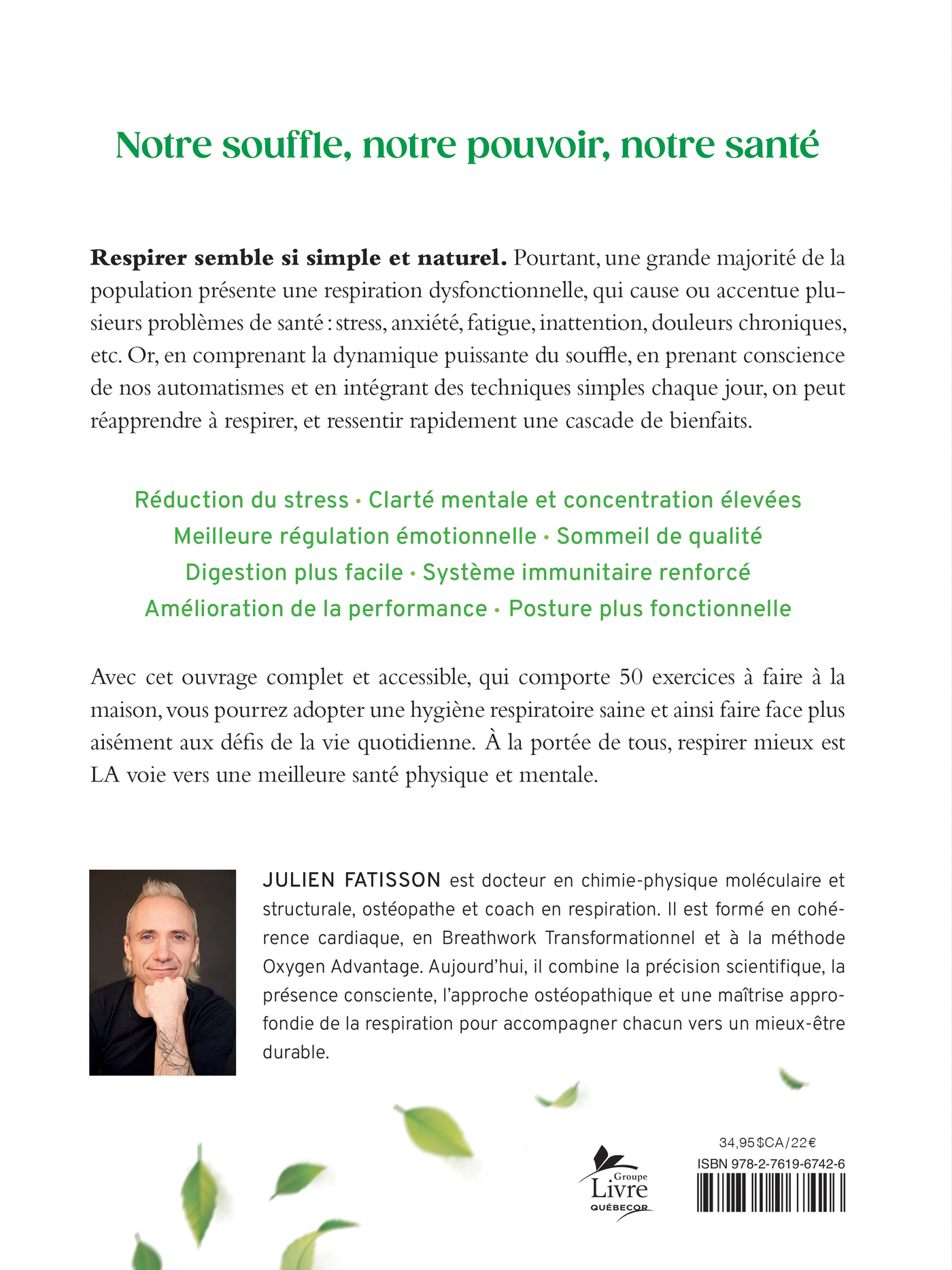 Respirer semble si simple et naturel. Pourtant, une grande majorité de la population présente une respiration dysfonctionnelle, qui cause ou accentue plusieurs problèmes de santé: stress, anxiété, fatigue, inattention, douleurs chroniques, etc. Or, en comprenant la dynamique puissante du souffle, en prenant conscience de nos automatismes et en intégrant des techniques simples chaque jour, on peut réapprendre à respirer, et ressentir rapidement une cascade de bienfaits.