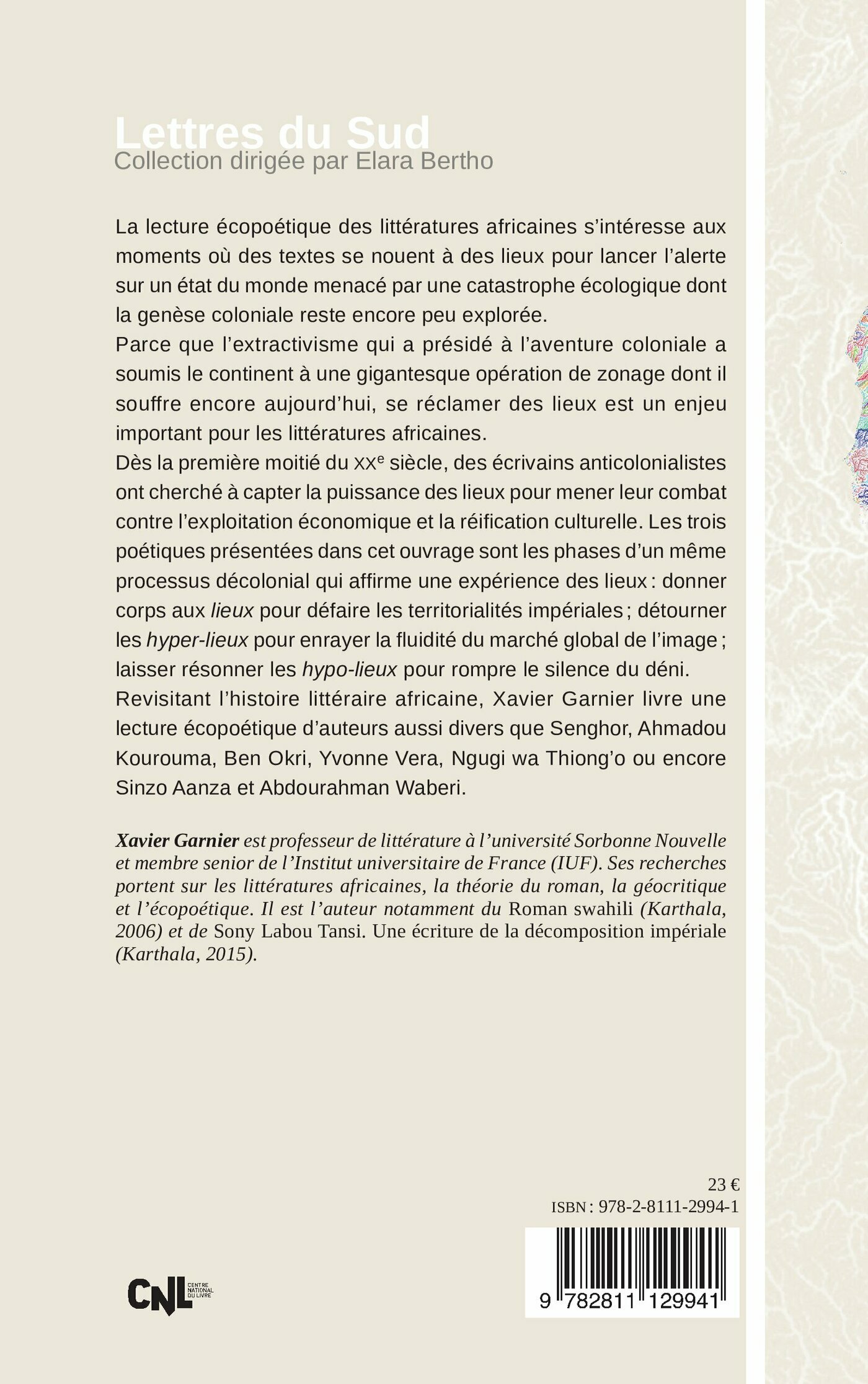 Revisitant l'histoire littéraire africaine, Xavier Garnier livre une lecture écopoétique d'auteurs aussi divers que Senghor, Ahmadou Kourouma, Ben Okri, Yvonne Vera, Ngugi wa Thiong'o ou encore Sinzo Aanza et Abdourahman Waberi.