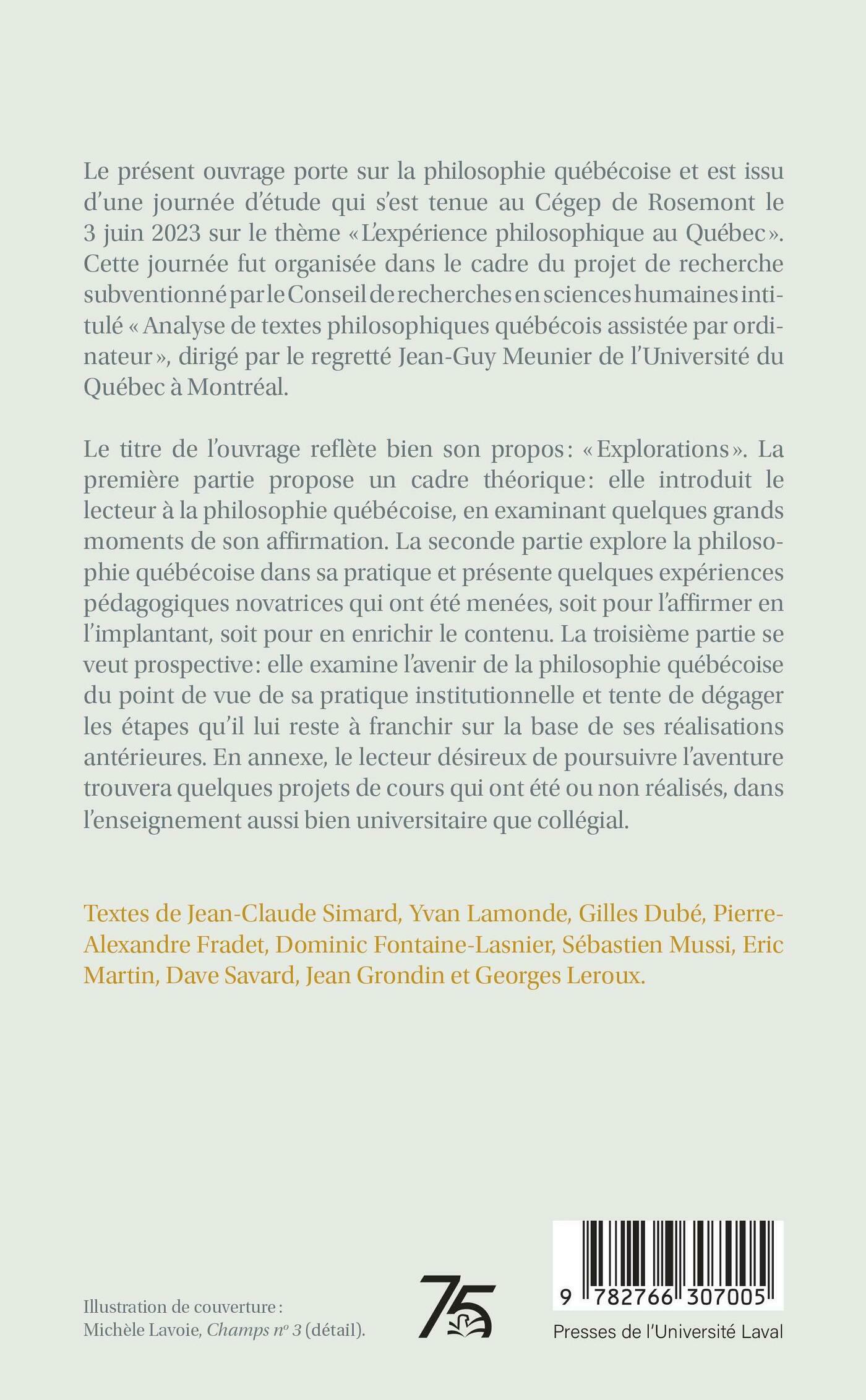 Le présent ouvrage porte sur la philosophie québécoise et est issu d’une journée d’étude qui s’est tenue au cégep de Rosemont le 3 juin 2023 sur le thème « L’expérience philosophique au Québec ». Cette journée fut organisée dans le cadre du projet de recherche subventionné par le Conseil de recherches en sciences humaines intitulé « Analyse de textes philosophiques québécois assistée par ordinateur », dirigé par le regretté Jean-Guy Meunier de l’Université du Québec à Montréal.Le titre de l’ouvrage reflète bien son propos : «Explorations ». La première partie propose un cadre théorique : elle introduit le lecteur à la philosophie québécoise, en examinant quelques grands moments de son affirmation. La seconde partie explore la philosophie québécoise dans sa pratique et présente quelques expériences pédagogiques novatrices qui ont été menées, soit pour l’affirmer en l’implantant, soit pour en enrichir le contenu. La troisième partie se veut prospective : elle examine l’avenir de la philosophie québécoise du point de vue de sa pratique institutionnelle et tente de dégager les étapes qu’il lui reste à franchir sur la base de ses réalisations antérieures. En annexe, le lecteur désireux de poursuivre l’aventure trouvera quelques projets de cours qui ont été ou non réalisés, dans l’enseignement aussi bien universitaire que collégial.