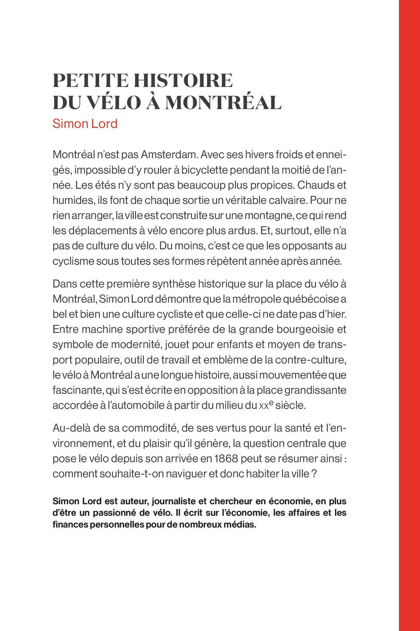 Dans cette première synthèse historique sur la place du vélo à Montréal, Simon Lord démontre que la métropole québécoise a bel et bien une culture cycliste et que celle-ci ne date pas d’hier. De l’arrivée du premier vélocipède au Québec en 1868 à l’avènement du BIXI et du Réseau express vélo (REV), il s’applique à dessiner le contour de la pratique cycliste sur l’île et à en retracer les hauts et les bas au gré des époques, en s’appuyant sur de nombreuses sources journalistiques et historiques ainsi que sur les grands projets d’urbanisation qui ont fait de Montréal la ville qu’elle est aujourd’hui. Entre machine sportive préférée de la grande bourgeoisie et symbole de modernité, jouet pour enfants et moyen de transport populaire, outil de travail et emblème de la contre-culture, le vélo à Montréal a une longue histoire, aussi mouvementée que fascinante, qui s’est écrite en opposition et en résistance à la place grandissante accordée à l’automobile à partir du milieu du XXe siècle. Car au-delà de sa commodité, de ses vertus pour la santé et l’environnement, et du plaisir qu’il génère, la question centrale que pose le vélo depuis cent cinquante ans peut se résumer ainsi : comment souhaite-t-on naviguer et donc habiter la ville ?