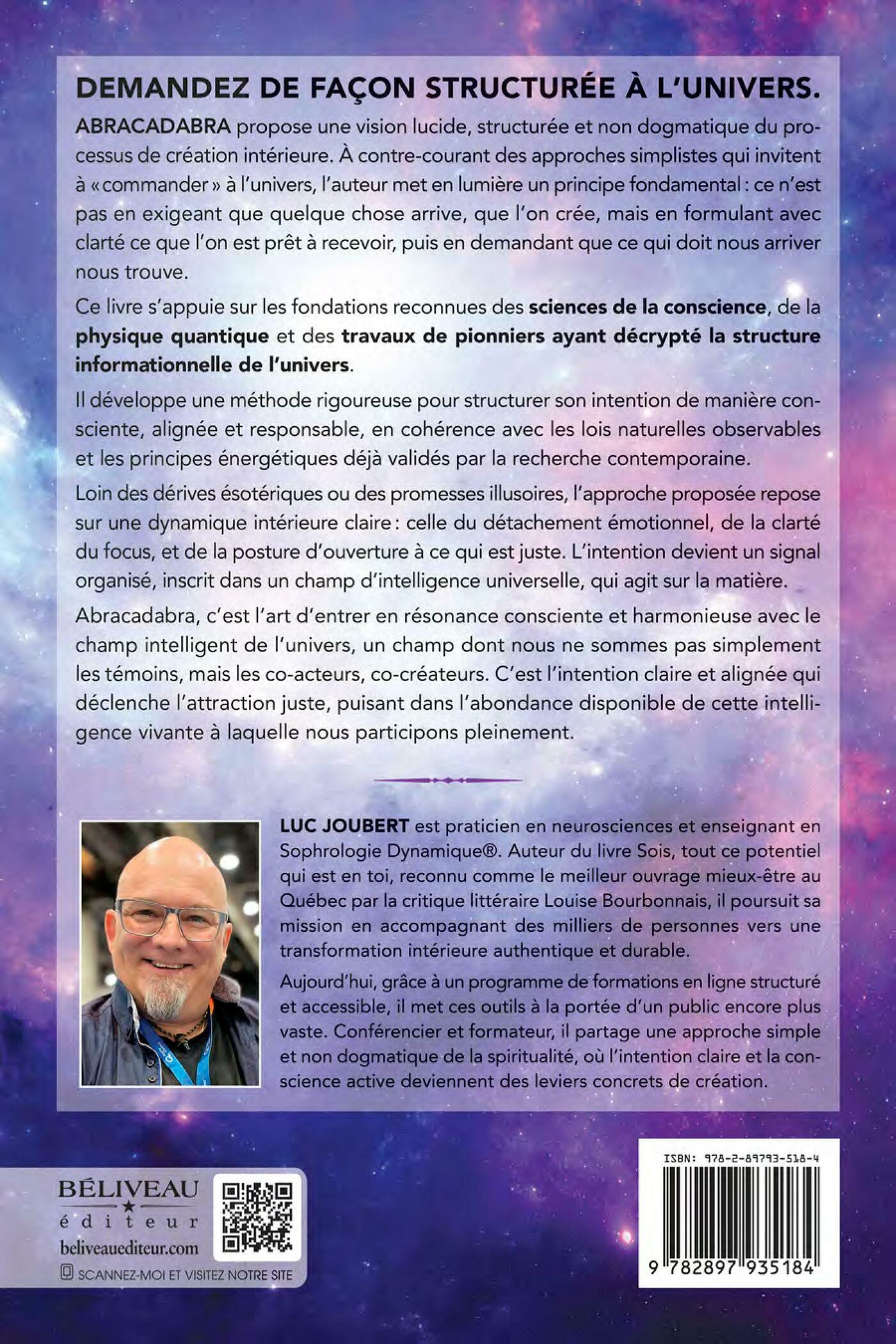Demandez de façon structurée à l’Univers.ABRACADABRA propose une vision lucide, structurée et non dogmatique du processus de création intérieure. À contre-courant des approches simplistes qui invitent à «commander» à l’univers, l’auteur met en lumière un principe fondamental: ce n’est pas en exigeant que quelque chose arrive, que l’on crée, mais en formulant avec clarté ce que l’on est prêt à recevoir, puis en demandant que ce qui doit nous arriver nous trouve.Ce livre s’appuie sur les fondations reconnues des sciences de la conscience, de la physique quantique et des travaux de pionniers ayant décrypté la structure informationnelle de l’univers.Il développe une méthode rigoureuse pour structurer son intention de manière consciente, alignée et responsable, en cohérence avec les lois naturelles observables et les principes énergétiques déjà validés par la recherche contemporaine.Loin des dérives ésotériques ou des promesses illusoires, l’approche proposée repose sur une dynamique intérieure claire : celle du détachement émotionnel, de la clarté du focus, et de la posture d’ouverture à ce qui est juste. L’intention devient un signal organisé, inscrit dans un champ d’intelligence universelle, qui agit sur la matière.Abracadabra, c’est l’art d’entrer en résonance consciente et harmonieuse avec le champ intelligent de l’univers, un champ dont nous ne sommes pas simplement les témoins, mais les co-acteurs, co-créateurs. C’est l’intention claire et alignée qui déclenche l’attraction juste, puisant dans l’abondance disponible de cette intelligence vivante à laquelle nous participons pleinement.