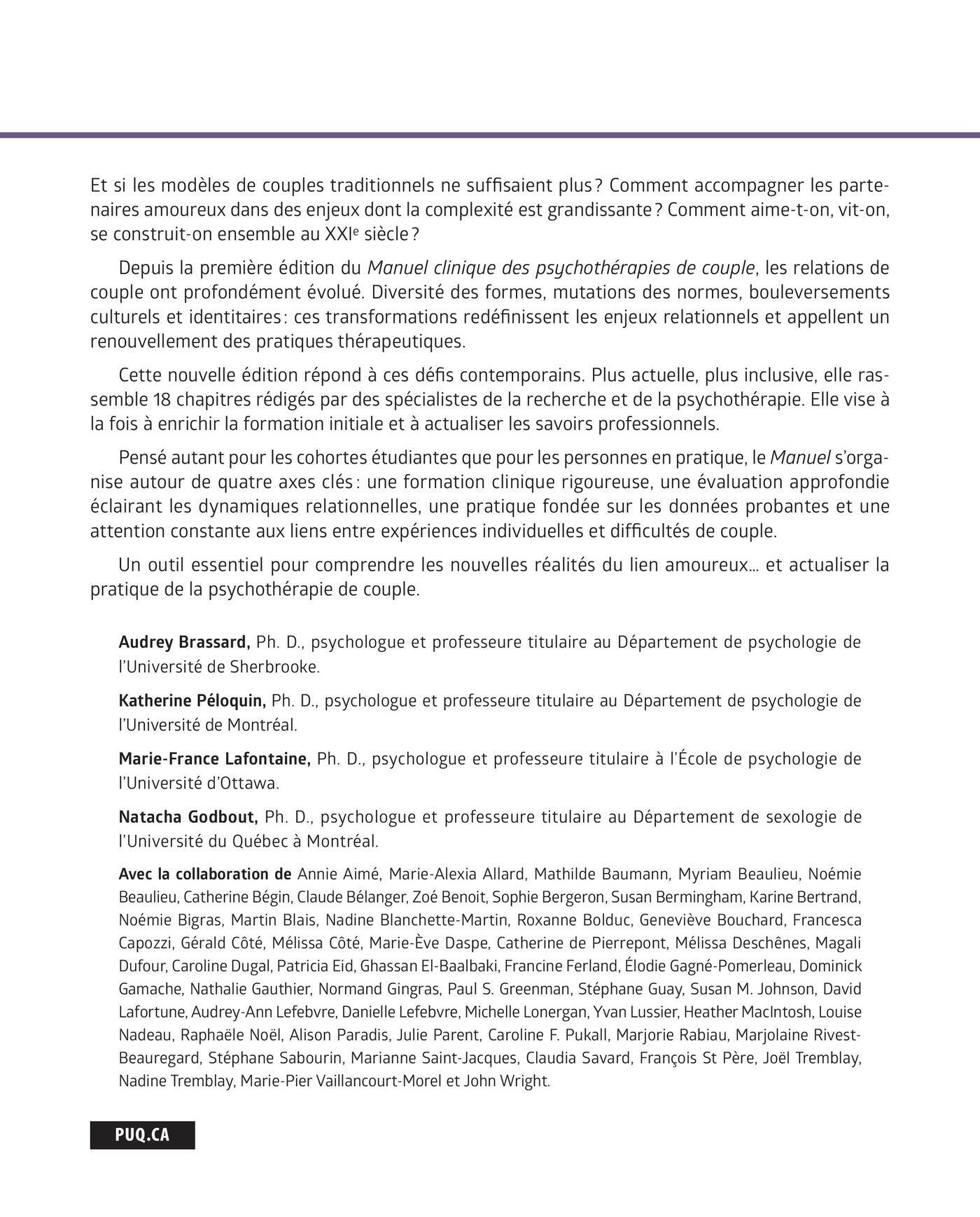 Cette nouvelle édition répond à ces défis contemporains. Plus actuelle, plus inclusive, elle rassemble 18 chapitres rédigés par des spécialistes de la recherche et de la psychothérapie. Elle vise à la fois à enrichir la formation initiale et à actualiser les savoirs professionnels. Pensé autant pour les cohortes étudiantes que pour les personnes en pratique, le Manuel s’organise autour de quatre axes clés : une formation clinique rigoureuse, une évaluation approfondie éclairant les dynamiques relationnelles, une pratique fondée sur les données probantes et une attention constante aux liens entre expériences individuelles et difficultés de couple.