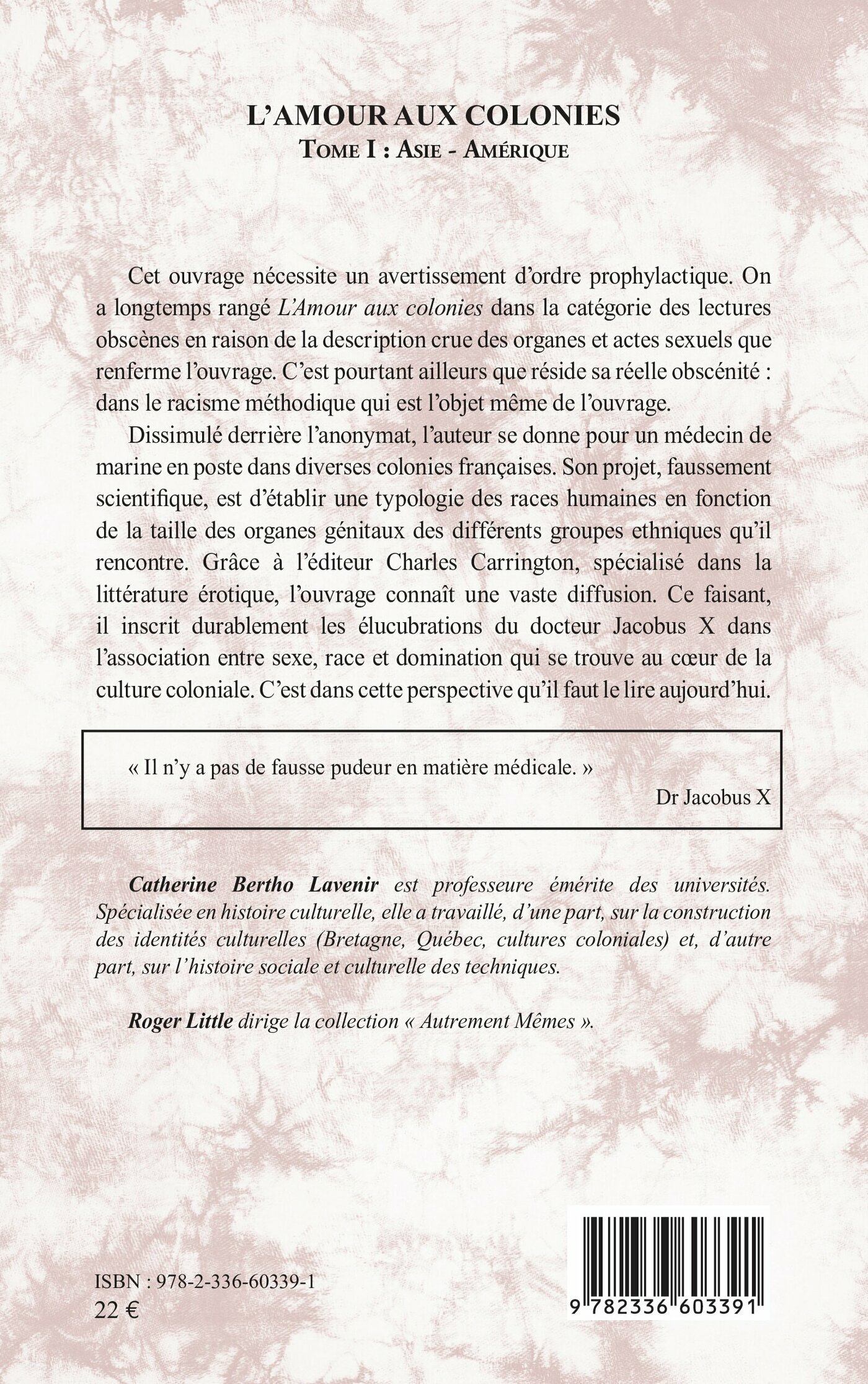 Dissimulé derrière l’anonymat, l’auteur se donne pour un médecin de marine en poste dans diverses colonies françaises. Son projet, faussement scientifique, est d’établir une typologie des races humaines en fonction de la taille des organes génitaux des différents groupes ethniques qu’il rencontre. Grâce à l’éditeur Charles Carrington, spécialisé dans la littérature érotique, l’ouvrage connaît une vaste diffusion. Ce faisant, il inscrit durablement les élucubrations du docteur Jacobus X dans l’association entre sexe, race et domination qui se trouve au cœur de la culture coloniale. C’est dans cette perspective qu’il faut le lire aujourd’hui.
