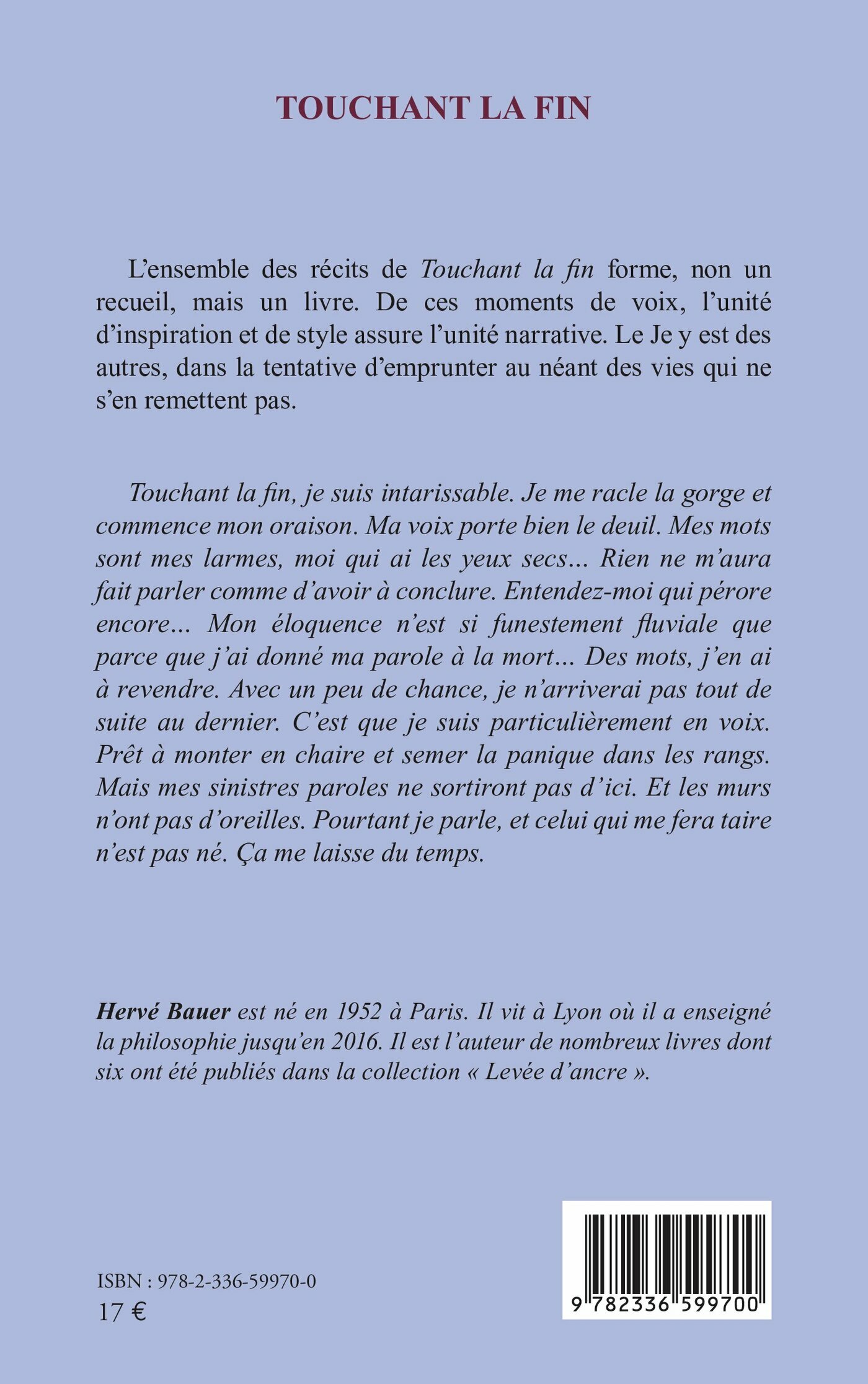 L’ensemble des récits de Touchant la fin forme, non un recueil, mais un livre. De ces moments de voix, l’unité d’inspiration et de style assure l’unité narrative. Le Je y est des autres, dans la tentative d’emprunter au néant des vies qui ne s’en remettent pas.