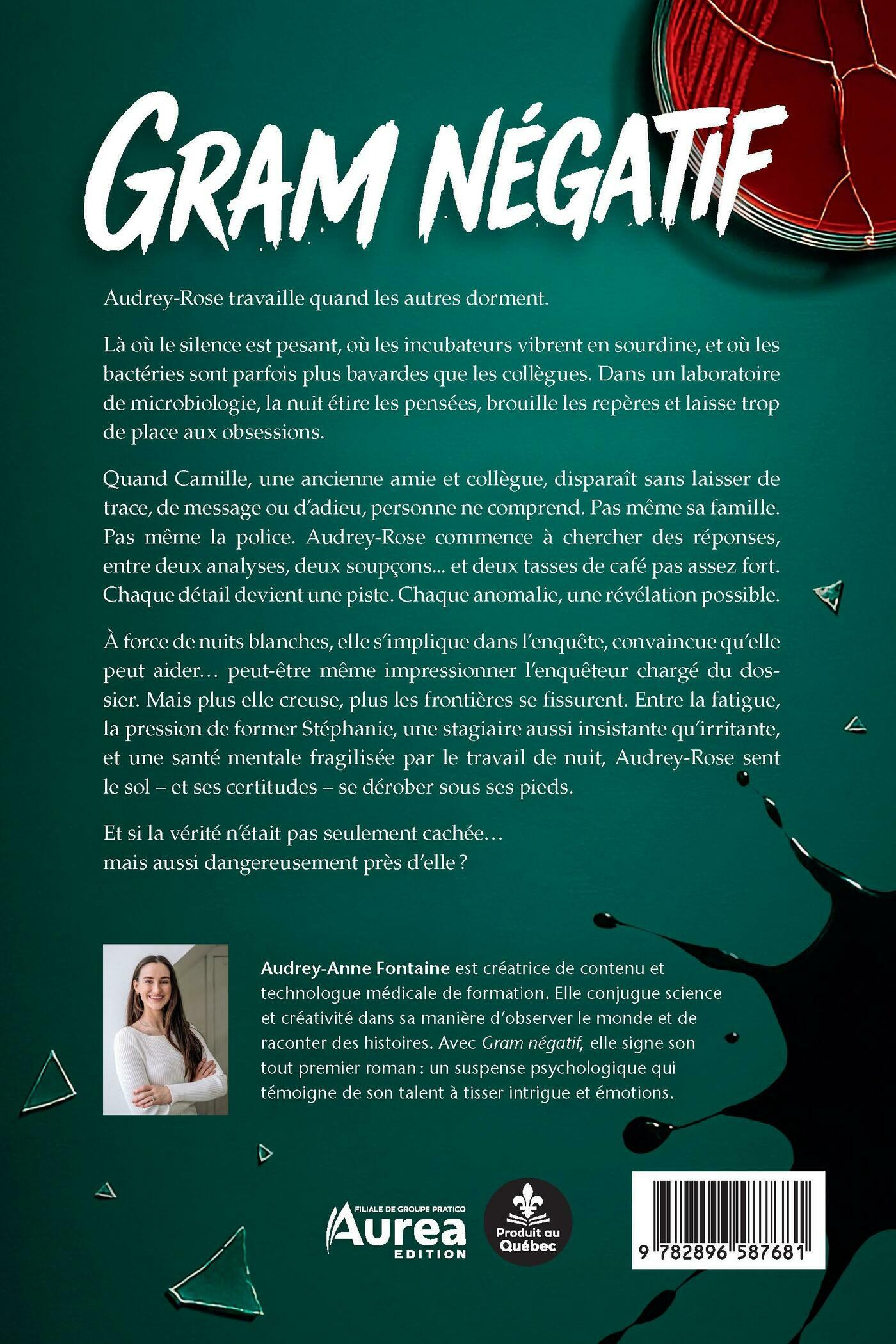 Audrey-Rose travaille quand les autres dorment.Là où le silence est pesant, où les incubateurs vibrent en sourdine, et où les bactéries sont parfois plus bavardes que les collègues. Dans un laboratoire de microbiologie, la nuit étire les pensées, brouille les repères et laisse trop de place aux obsessions.Quand Camille, une ancienne amie et collègue, disparaît sans laisser de trace, de message ou d’adieu, personne ne comprend. Pas même sa famille. Pas même la police. Audrey-Rose commence à chercher des réponses, entre deux analyses, deux soupçons... et deux tasses de café pas assez fort. Chaque détail devient une piste. Chaque anomalie, une révélation possible. À force de nuits blanches, elle s’implique dans l’enquête, convaincue qu’elle peut aider… peut-être même impressionner l’enquêteur chargé du dossier. Mais plus elle creuse, plus les frontières se fissurent. Entre la fatigue, la pression de former Stéphanie, une stagiaire aussi insistante qu’irritante, et une santé mentale fragilisée par le travail de nuit, Audrey-Rose sent le sol – et ses certitudes – se dérober sous ses pieds. Et si la vérité n’était pas seulement cachée…mais aussi dangereusement près d’elle ?