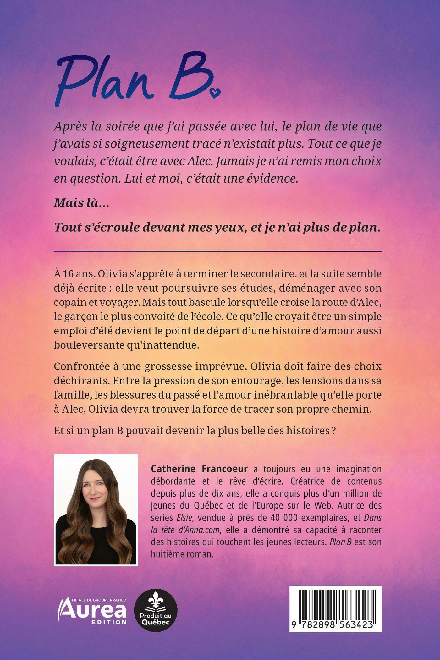 À 16 ans, Olivia s’apprête à terminer le secondaire, et la suite semble déjà écrite : elle veut poursuivre ses études, déménager avec son copain et voyager. Mais tout bascule lorsqu’elle croise la route d’Alec, le garçon le plus convoité de l’école. Ce qu’elle croyait être un simple emploi d’été devient le point de départ d’une histoire d’amour aussi bouleversante qu’inattendue.Confrontée à une grossesse imprévue, Olivia doit faire des choix déchirants. Entre la pression de son entourage, les tensions dans sa famille, les blessures du passé et l’amour inébranlable qu’elle porte à Alec, Olivia devra trouver la force de tracer son propre chemin.Et si un plan B pouvait devenir la plus belle des histoires ?