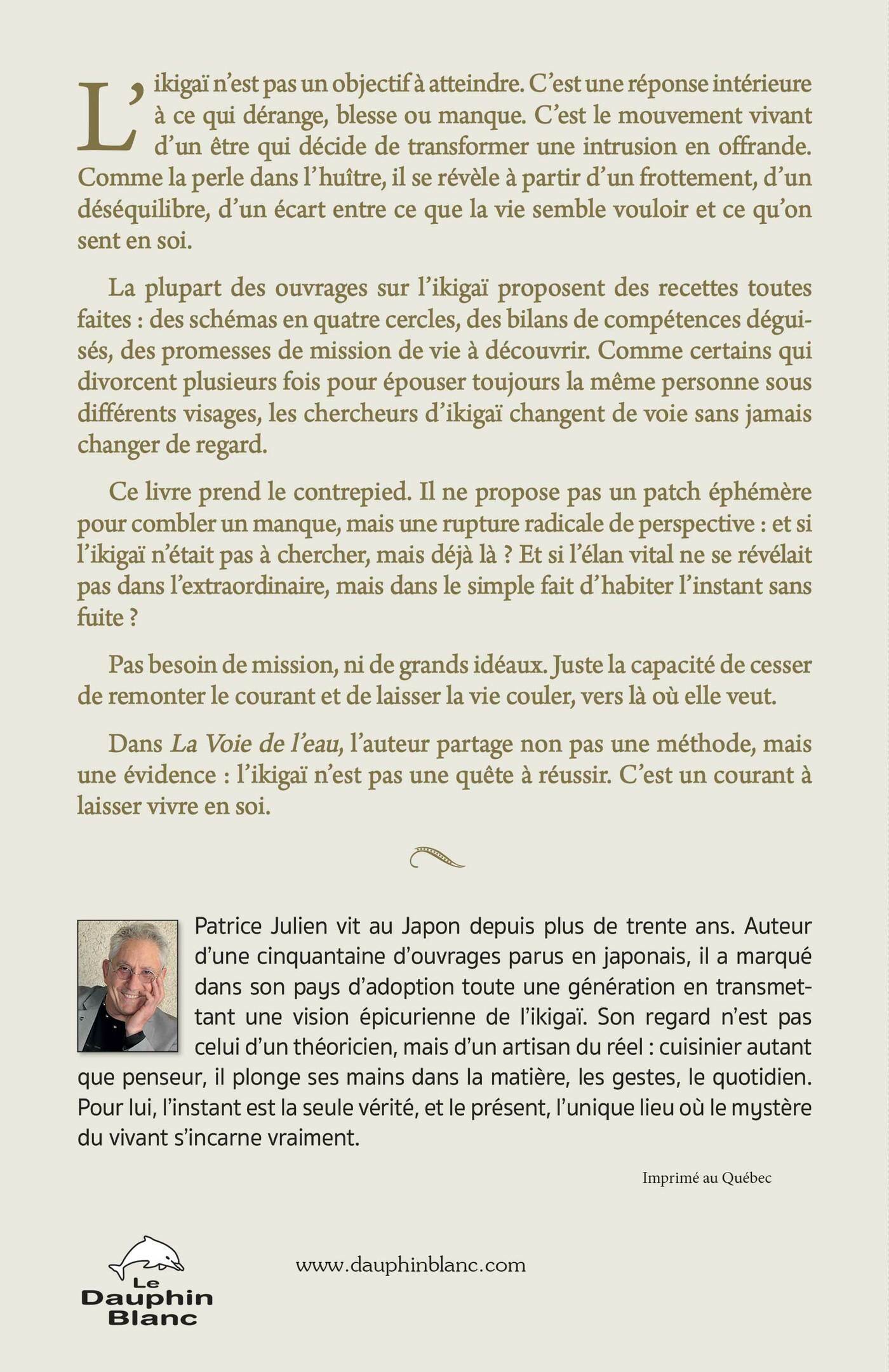 L’ikigaï n’est pas un objectif à atteindre. C’est une réponse intérieure à ce qui dérange, blesse ou manque. C’est le mouvement vivant d’un être qui décide de transformer une intrusion en offrande. Comme la perle dans l’huître, il se révèle à partir d’un frottement, d’un déséquilibre, d’un écart entre ce que la vie semble vouloir et ce qu’on sent en soi.La plupart des ouvrages sur l’ikigaï proposent des recettes toutes faites: des schémas en quatre cercles, des bilans de compétences déguisés, des promesses de mission de vie à découvrir. Comme certains qui divorcent plusieurs fois pour épouser toujours la même personne sous différents visages, les chercheurs d’ikigaï changent de voie sans jamais changer de regard. Ce livre prend le contrepied. Il ne propose pas un patch éphémère pour combler un manque, mais une rupture radicale de perspective: et si l’ikigaï n’était pas à chercher, mais déjà là? Et si l’élan vital ne se révélait pas dans l’extraordinaire, mais dans le simple fait d’habiter l’instant sans fuite? Pas besoin de mission, ni de grands idéaux. Juste la capacité de cesser de remonter le courant et de laisser la vie couler, vers là où elle veut. Dans La Voie de l’eau, l’auteur partage non pas une méthode, mais une évidence: l’ikigaï n’est pas une quête à réussir. C’est un courant à laisser vivre en soi.L'auteur:Patrice Julien vit au Japon depuis plus de trente ans. Auteur d’une cinquantaine d’ouvrages parus en japonais, il a marqué dans son pays d’adoption toute une génération en transmettant une vision épicurienne de l’ikigaï. Son regard n’est pas celui d’un théoricien, mais d’un artisan du réel: cuisinier autant que penseur, il plonge ses mains dans la matière, les gestes, le quotidien. Pour lui, l’instant est la seule vérité, et le présent, l’unique lieu où le mystère du vivant s’incarne vraiment.