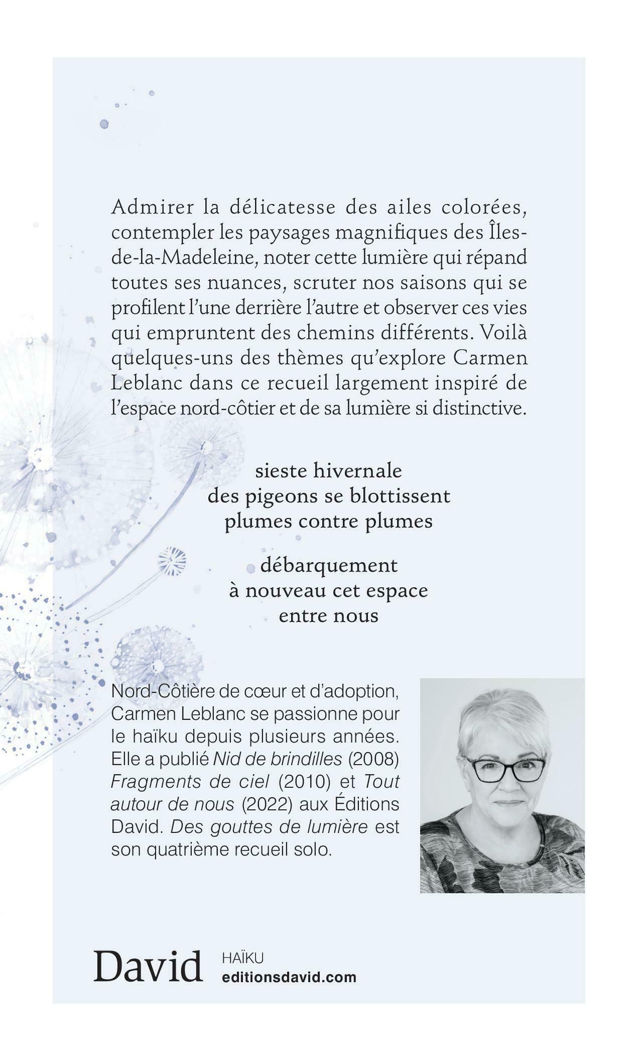 Admirer la délicatesse des ailes colorées, contempler les paysages magnifiques des Îles de-la-Madeleine, noter cette lumière qui répand toutes ses nuances, scruter nos saisons qui se profilent l’une derrière l’autre et observer ces vies qui empruntent des chemins différents. Voilà quelques-uns des thèmes qu’explore Carmen Leblanc dans ce recueil largement inspiré de l’espace nord-côtier et de sa lumière si distinctive.sieste hivernaledes pigeons se blottissentplumes contre plumesdébarquementà nouveau cet espaceentre nousNord-Côtière de coeur et d’adoption, Carmen Leblanc se passionne pour le haïku depuis plusieurs années. Elle a publié Nid de brindilles (2008) Fragments de ciel (2010) et Tout autour de nous (2022) aux Éditions David. Des gouttes de lumière est son quatrième recueil solo.