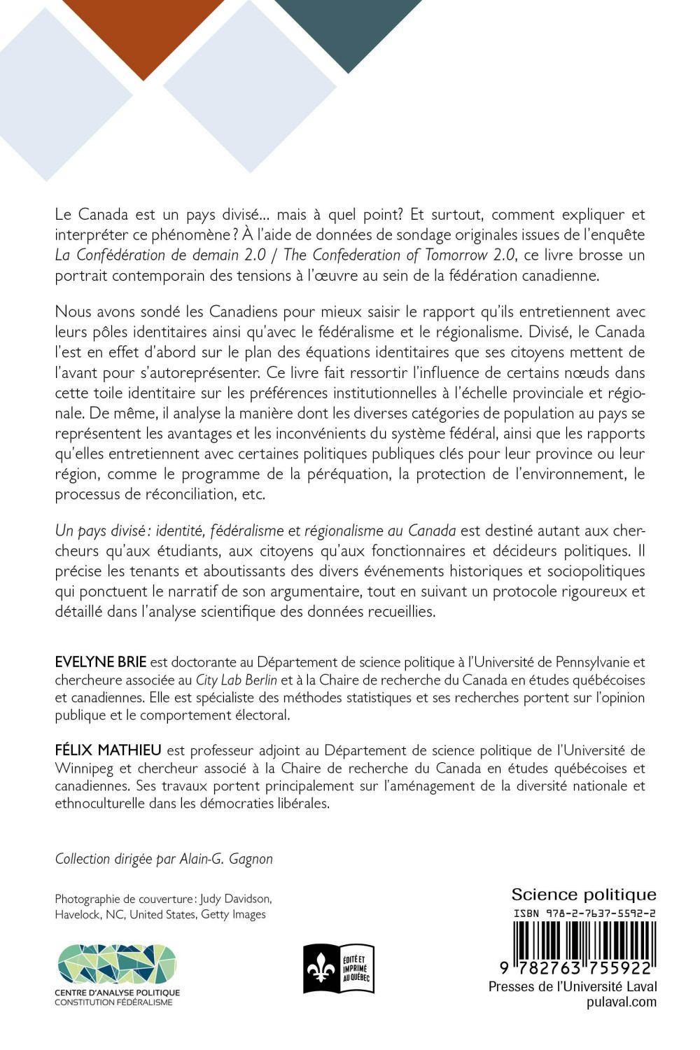 Le Canada est un pays divisé… mais à quel point? Et surtout, comment expliquer et interpréter ce phénomène ? À l’aide de données de sondage originales issues de l’enquête La Confédération de demain 2.0 / The Confederation of Tomorrow 2.0, ce livre brosse un portrait contemporain des tensions à l’œuvre au sein de la fédération canadienne.Nous avons sondé les Canadiens pour mieux saisir le rapport qu’ils entretiennent avec leurs pôles identitaires ainsi qu'avec le fédéralisme et le régionalisme. Divisé, le Canada l’est en effet d’abord sur le plan des équations identitaires que ses citoyens mettent de l’avant pour s’autoreprésenter. Ce livre fait ressortir l’influence de certains nœuds dans cette toile identitaire sur les préférences institutionnelles à l’échelle provinciale et régionale. De même, il analyse la manière dont les diverses catégories de population au pays se représentent les avantages et les inconvénients du système fédéral, ainsi que les rapports qu’elles entretiennent avec certaines politiques publiques clés pour leur province ou leur région, comme le programme de la péréquation, la protection de l’environnement, le processus de réconciliation, etc.Un pays divisé : identité, fédéralisme et régionalisme au Canada est destiné autant aux chercheurs qu’aux étudiants, aux citoyens qu’aux fonctionnaires et décideurs politiques. Il précise les tenants et aboutissants des divers événements historiques et sociopolitiques qui ponctuent le narratif de son argumentaire, tout en suivant un protocole rigoureux et détaillé dans l’analyse scientifique des données recueillies.