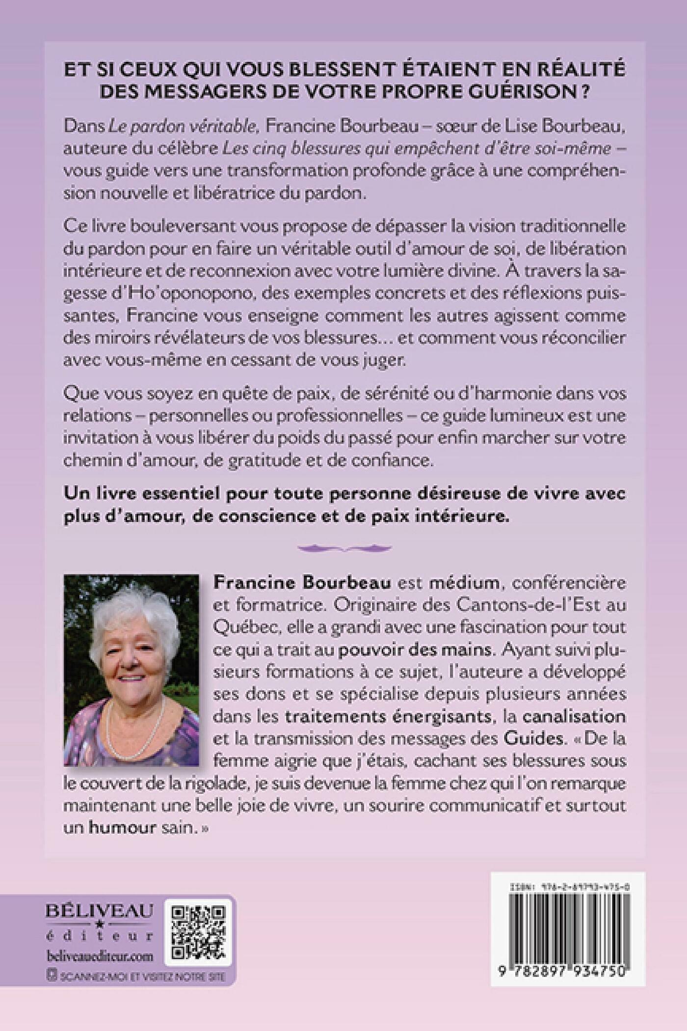 Et si le pardon n’était pas un acte envers l’autre, mais un acte sacré envers soi ? Dans Le pardon véritable, Francine Bourbeau – soeur de Lise Bourbeau, auteure du célèbre Les 5 blessures de l’âme – vous guide vers une transformation profonde grâce à une compréhension nouvelle et libératrice du pardon. Ce livre bouleversant vous propose de dépasser la vision traditionnelle du pardon pour en faire un véritable outil d’amour de soi, de libération intérieure et de reconnexion avec votre lumière divine. À travers la sagesse d’Ho’oponopono, des exemples concrets et des réflexions puissantes, Francine vous enseigne comment les autres agissent comme des miroirs révélateurs de vos blessures… et comment vous réconcilier avec vous-même en cessant de vous juger. Que vous soyez en quête de paix, de sérénité ou d’harmonie dans vos relations – personnelles ou professionnelles – ce guide lumineux est une invitation à vous libérer du poids du passé pour enfin marcher sur votre chemin d’amour, de gratitude et de confiance. Un livre essentiel pour toute personne désireuse de vivre avec plus d’amour, de conscience et de paix intérieure.