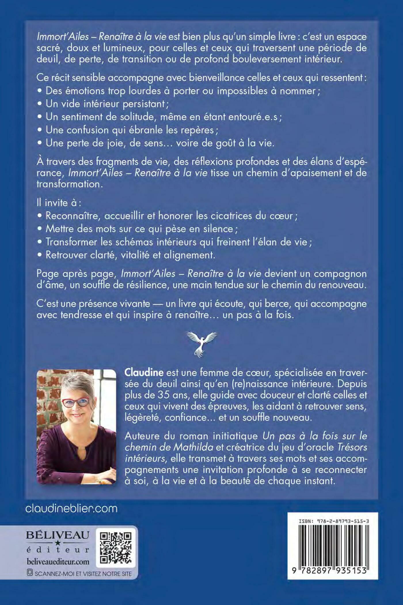 Immort’Ailes est bien plus qu’un journal : c’est un espace sacré, doux et lumineux, conçu pour celles et ceux qui traversent une période de perte, de transition ou de profond bouleversement intérieur. Ce carnet accompagne avec bienveillance celles et ceux qui ressentent :- des émotions trop lourdes à porter ou impossibles à nommer,– un vide intérieur persistant,– une confusion qui ébranle leurs repères,– une perte de joie, de sens… voire de goût à la vie.À travers des exercices puissants, des réflexions guidées et des espaces d’écriture, ce carnet vous invite à :– accueillir et honorer vos blessures,– mettre des mots sur l’indicible,– transformer vos schémas intérieurs limitants,– retrouver clarté, vitalité et alignement.Page après page, Immort’Ailes devient un allié de résilience, un compagnon d’âme pour reconnecter à votre lumière et reconstruire une vie fidèle à votre vérité profonde.Ce n’est pas un guide figé. C’est un souffle, une présence, une main tendue sur le chemin du renouveau.
