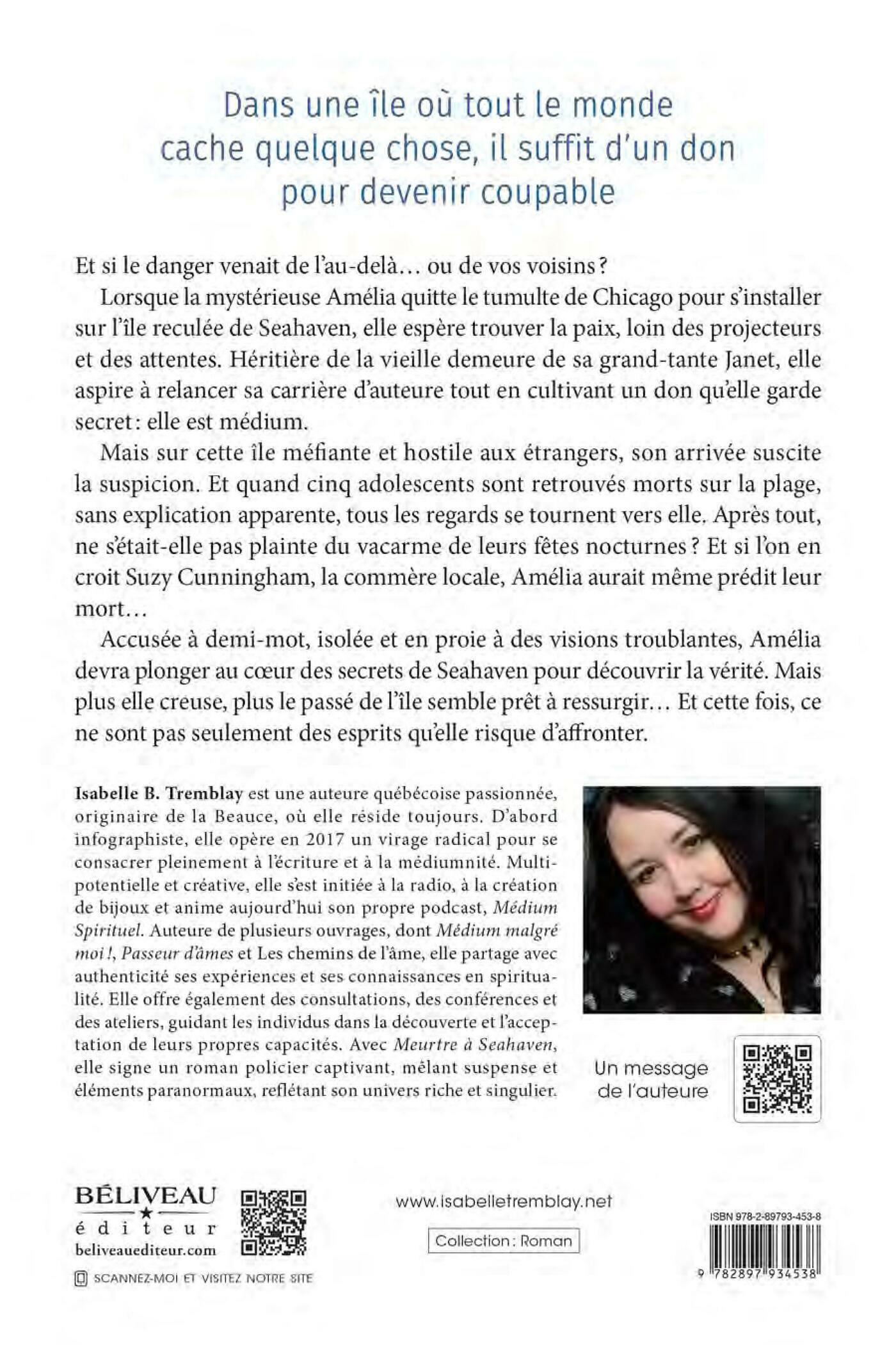 Dans une île où tout le monde cache quelque chose, il suffit d’un don pour devenir coupable.Et si le danger venait de l’au-delà… ou de vos voisins ? Lorsque la mystérieuse Amélia quitte le tumulte de Chicago pour s’installer sur l’île reculée de Seahaven, elle espère trouver la paix, loin des projecteurs et des attentes. Héritière de la vieille demeure de sa grand-tante Janet, elle aspire relancer sa carrière d’auteure tout en cultivant un don qu’elle garde secret : elle est médium.Mais sur cette île méfiante et hostile aux étrangers, son arrivée suscite la suspicion. Et quand cinq adolescents sont retrouvés morts sur la plage, sans explication apparente, tous les regards se tournent vers elle. Après tout, ne s’était-elle pas plainte du vacarme de leurs fêtes nocturnes ? Et si l’on en croit Suzy Cunningham, la commère locale, Amélia aurait même prédit leur mort…Accusée à demi-mot, isolée et en proie à des visions troublantes, Amélia devra plonger au cœur des secrets de Seahaven pour découvrir la vérité. Mais plus elle creuse, plus le passé de l’île semble prêt à ressurgir… Et cette fois, ce ne sont pas seulement des esprits qu’elle risque d’affronter.
