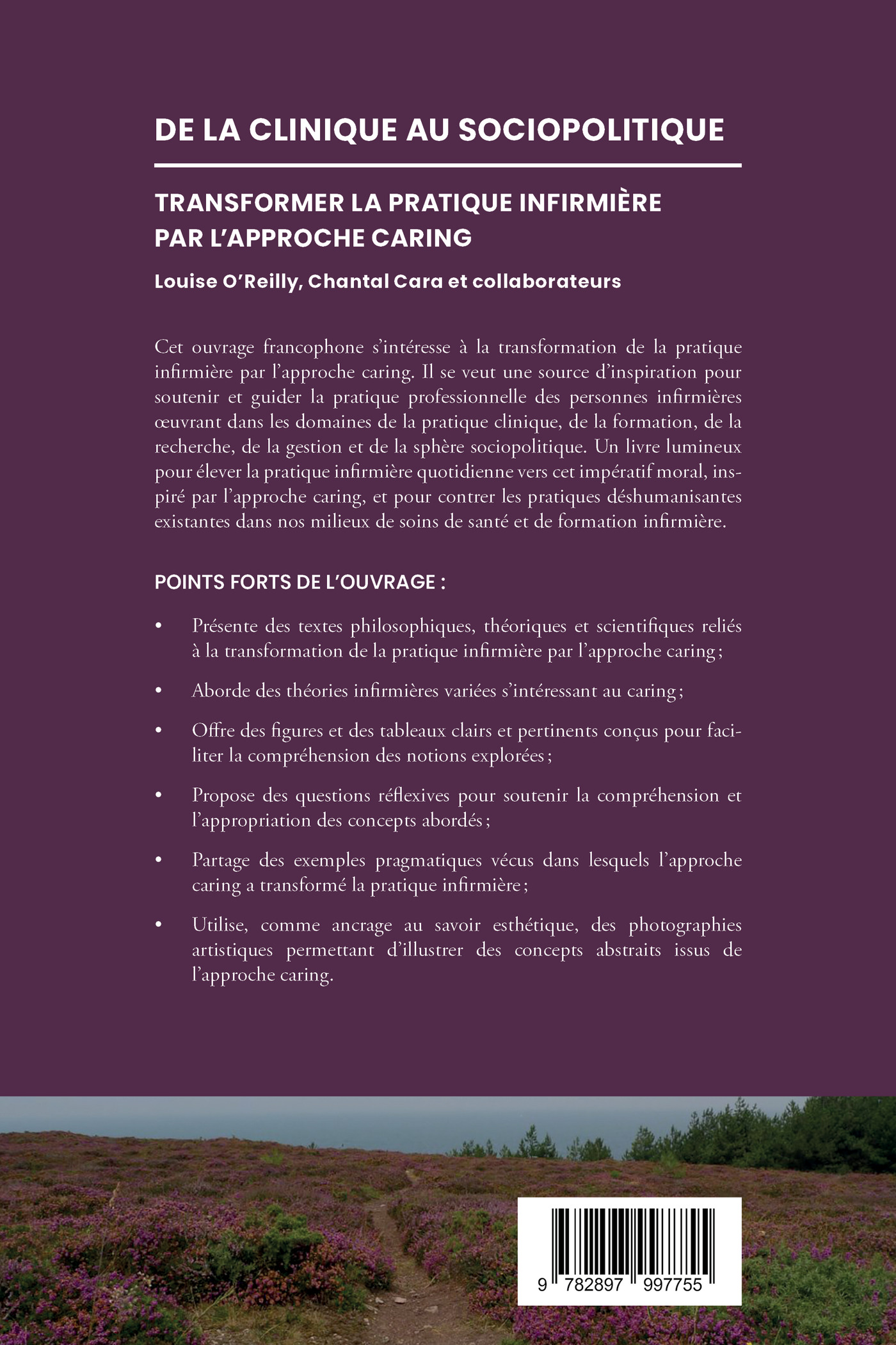 Cet ouvrage francophone s’intéresse à la transformation de la pratique infirmière par l’approche caring. Il se veut une source d’inspiration pour soutenir et guider la pratique professionnelle des personnes infirmières oeuvrant dans les domaines de la pratique clinique, de la formation, de la recherche, de la gestion et de la sphère sociopolitique. Un livre lumineux pour élever la pratique infirmière quotidienne vers cet impératif moral, inspiré par l’approche caring, et pour contrer les pratiques déshumanisantes existantes dans nos milieux de soins de santé et de formation infirmière.POINTS FORTS DE L’OUVRAGE :- Présente des textes philosophiques, théoriques et scientifiques reliés à la transformation de la pratique infirmière par l’approche caring ;- Aborde des théories infirmières variées s’intéressant au caring ;- Offre des figures et des tableaux clairs et pertinents conçus pour faciliter la compréhension des notions explorées ;- Propose des questions réflexives pour soutenir la compréhension et l’appropriation des concepts abordés ;- Partage des exemples pragmatiques vécus dans lesquels l’approche caring a transformé la pratique infirmière ;- Utilise, comme ancrage au savoir esthétique, des photographies artistiques permettant d’illustrer des concepts abstraits issus de l’approche caring.