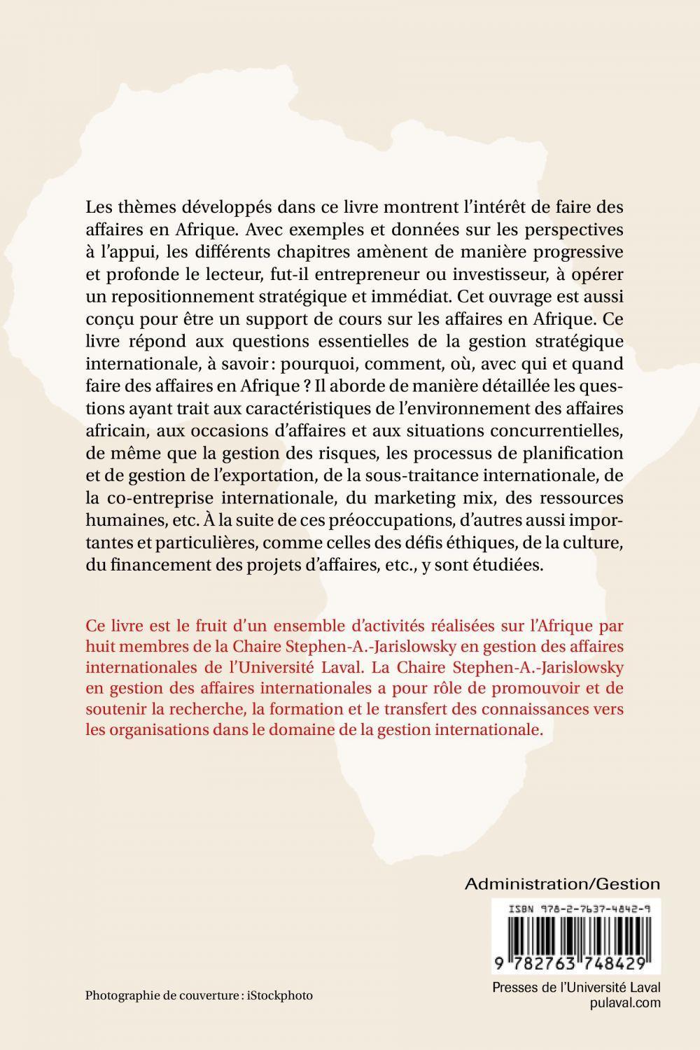 Les thèmes développés dans ce livre montrent l’intérêt à faire des affaires en Afrique. Avec exemples et données sur les perspectives à l’appui, les différents chapitres amènent de manière progressive et profonde le lecteur, fut-il entrepreneur ou investisseur, à opérer un repositionnement stratégique et immédiat. Cet ouvrage est aussi conçu pour être un support de cours sur les affaires en Afrique. Ce livre répond aux questions essentielles de la gestion stratégique internationale, à savoir : pourquoi, comment, où, avec qui et quand faire les affaires en Afrique ? De plus, il aborde de manière détaillée les questions ayant trait aux caractéristiques de l’environnement des affaires africain, aux occasions d’affaires et aux situations concurrentielles de même que la gestion des risques, les processus de planification et de gestion de l’exportation, de la sous-traitance internationale, de la co-entreprise internationale, du marketing mix, des ressources humaines, etc. À la suite de ces préoccupations, d’autres aussi importantes et particulières, comme celle des défis éthiques, de la culture, du financement des projets d’affaires, etc., y sont étudiées.Ce livre est le fruit d’un ensemble d’activités réalisées sur l’Afrique par huit membres de la Chaire Stephen-A.-Jarislowsky en gestion des affaires internationales de l’Université Laval. La Chaire Stephen-A.-Jarislowsky en gestion des affaires internationales a pour rôle de promouvoir et de soutenir la recherche, la formation et le transfert des connaissances vers les organisations dans le domaine de la gestion internationale.