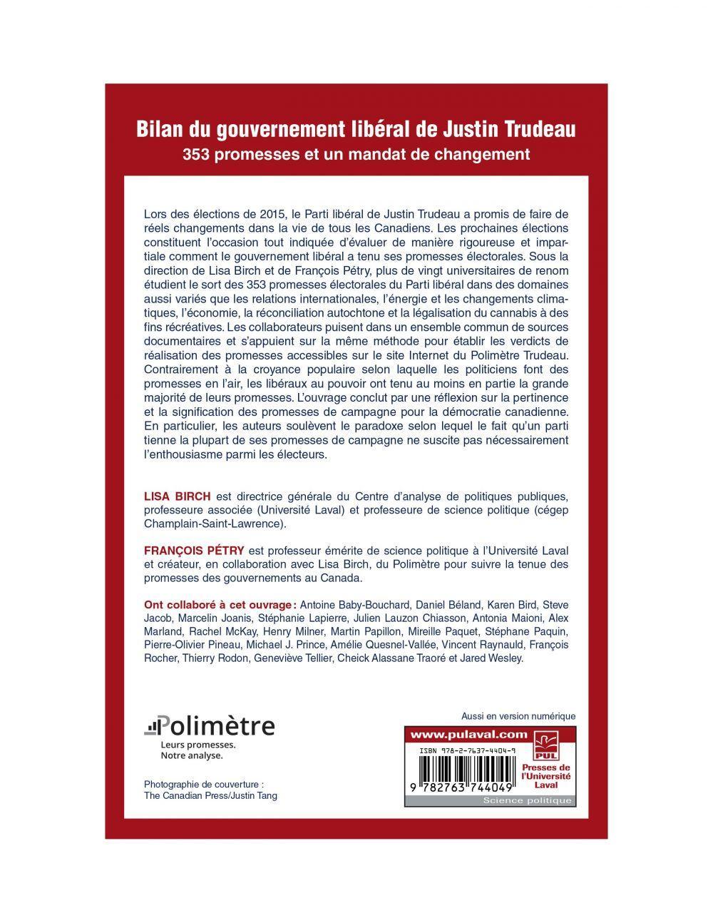 Lors des élections de 2015, le Parti libéral de Justin Trudeau a promis de faire de réels changements dans la vie de tous les Canadiens. Les prochaines élections constituent l’occasion tout indiquée d’évaluer de manière rigoureuse et impartiale comment le gouvernement libéral a tenu ses promesses électorales. Sous la direction de Lisa Birch et de François Pétry, plus de vingt universitaires de renom étudient le sort des 353 promesses électorales du Parti libéral dans des domaines aussi variés que les relations internationales, l’énergie et les changements climatiques, l’économie, la réconciliation autochtone et la légalisation du cannabis à des fins récréatives. Les collaborateurs puisent dans un ensemble commun de sources documentaires et s’appuient sur la même méthode pour établir les verdicts de réalisation des promesses accessibles sur le site Internet du Polimètre Trudeau. Contrairement à la croyance populaire selon laquelle les politiciens font des promesses en l'air, les libéraux au pouvoir ont tenu au moins en partie la grande majorité de leurs promesses. L’ouvrage conclut par une réflexion sur la pertinence et la signification des promesses de campagne pour la démocratie canadienne. En particulier, les auteurs soulèvent le paradoxe selon lequel le fait qu’un parti tienne la plupart de ses promesses de campagne ne suscite pas nécessairement l’enthousiasme parmi les électeurs.Ont collaboré à cet ouvrage : Antoine Baby-Bouchard, Daniel Béland, Karen Bird, Steve Jacob, Marcelin Joanis, Julien Lauzon Chiasson, Rachel McKay, Antonia Maioni, Alex Marland, Henry Milner, Martin Papillon, Mireille Paquet, Stéphane Paquin, Michael Prince, Amélie Quesnel-Vallée, Vincent Raynauld, François Rocher, Thierry Rodon, Geneviève Tellier, Cheick Alassane Traoré et Jared Wesley.