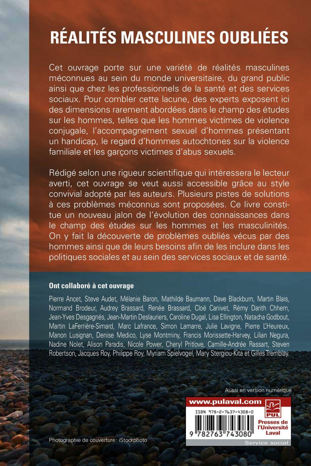 Cet ouvrage porte sur une variété de réalités masculines méconnues au sein du monde universitaire, du grand public ainsi que chez les professionnels de la santé et des services sociaux. Certaines de ces réalités sont même invisibles, inconnues. Pour combler cette lacune, des experts exposent ici des dimensions rarement abordées dans le champ des études sur les hommes, telles que les hommes victimes de violence conjugale, l’accompagnement sexuel d’hommes présentant un handicap, le regard d’hommes autochtones sur la violence familiale et les garçons victimes d’abus sexuels. Rédigé selon une rigueur scientifique qui intéressera le lecteur averti, cet ouvrage se veut aussi accessible grâce au style convivial adopté par les auteurs. Plusieurs pistes de solutions à ces problèmes méconnus sont proposées. Ce livre constitue un nouveau jalon de l’évolution des connaissances dans le champ des études sur les hommes et les masculinités. On y fait la découverte de problèmes oubliés vécus par des hommes ainsi que de leurs besoins afin de les inclure dans les politiques sociales et au sein des services sociaux et de santé.