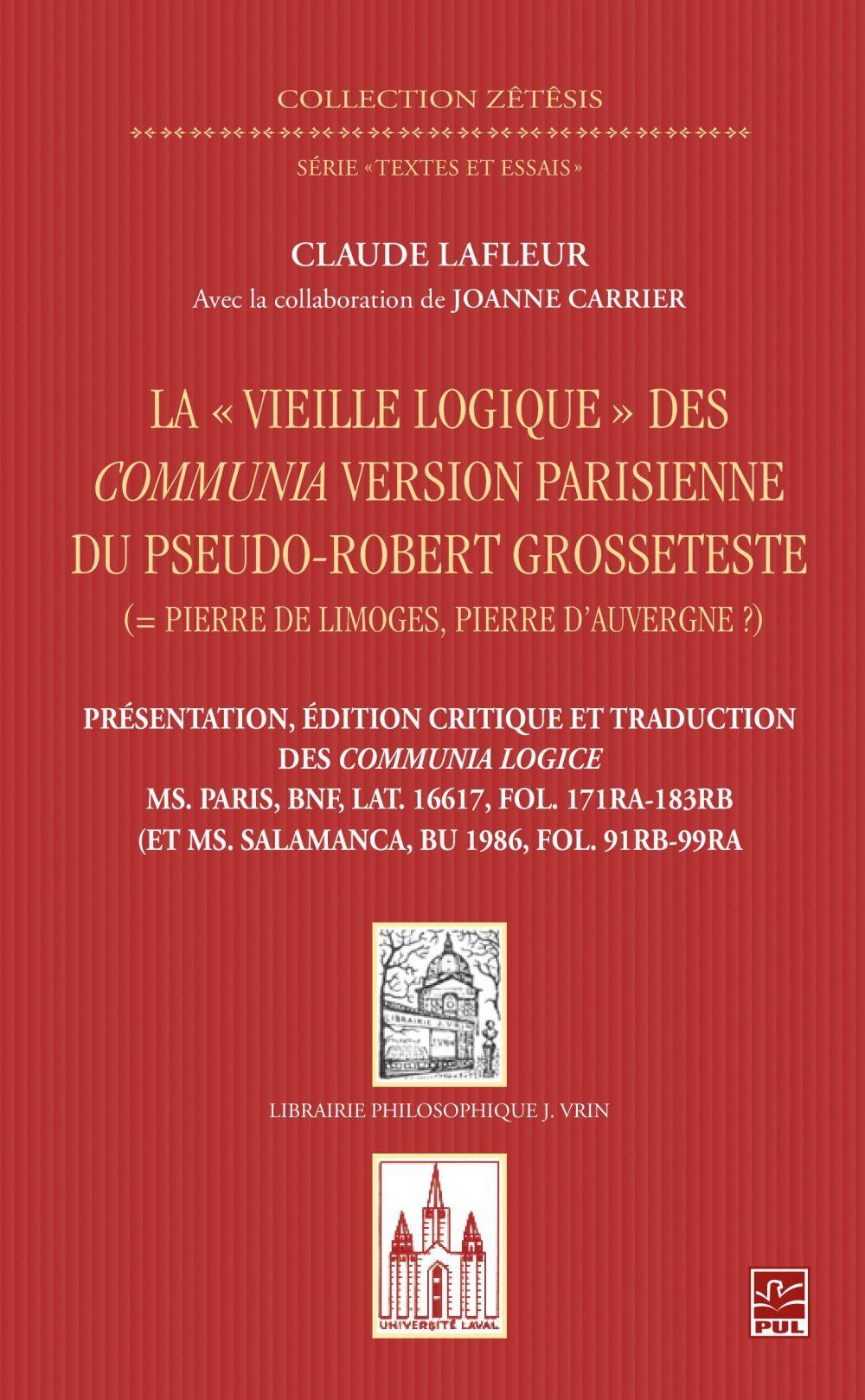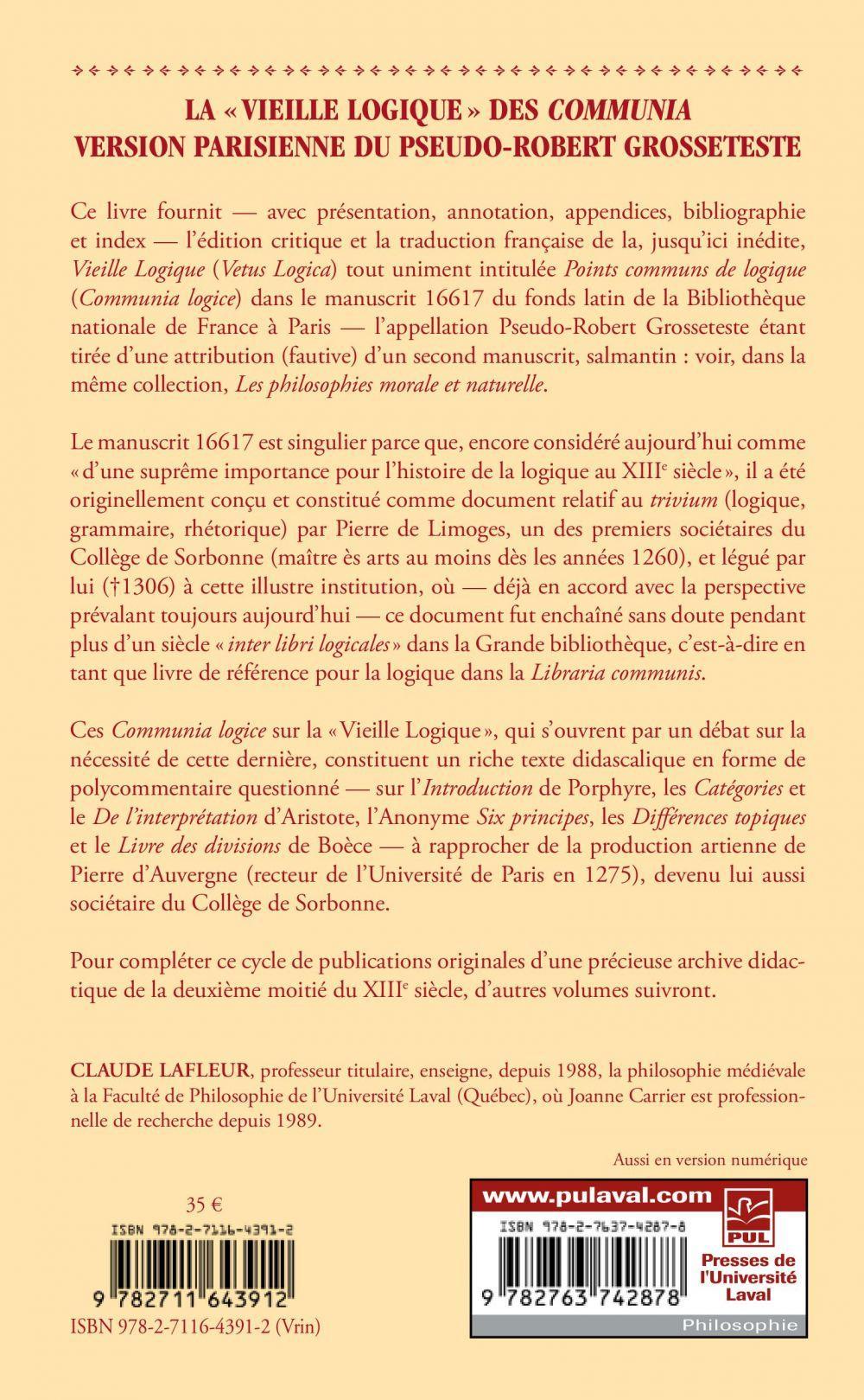 Ce livre fournit — avec présentation, annotation, appendices, bibliographie et index — l’édition critique et la traduction française de la, jusqu’ici inédite, Vieille Logique (Vetus Logica) tout uniment intitulée Points communs de logique (Communia logice) dans le manuscrit 16617 du fonds latin de la Bibliothèque nationale de France à Paris — l’appellation Pseudo-Robert Grosseteste étant tirée d’une attribution (fautive) d’un second manuscrit, salmantin : voir, dans la même collection, Les philosophies morale et naturelle.Le manuscrit 16617 est singulier parce que, encore considéré aujourd’hui comme « d’une suprême importance pour l’histoire de la logique au XIIIe siècle », il a été originellement conçu et constitué comme document relatif au trivium (logique, grammaire, rhétorique) par Pierre de Limoges, un des premiers socié- taires du Collège de Sorbonne (maître ès arts au moins dès les années 1260), et légué par lui (†1306) à cette illustre institution, où — déjà en accord avec la perspective prévalant toujours aujourd’hui — ce document fut enchaîné sans dou- te pendant plus d’un siècle « inter libri logicales » dans la Grande bibliothèque, c’est-à-dire en tant que livre de référence pour la logique dans la Libraria communis.Ces Communia logice sur la « Vieille Logique », qui s’ouvrent par un débat sur la nécessité de cette dernière, constituent un riche texte didascalique en forme de polycommentaire questionné — sur l’Introduction de Porphyre, les Catégories et le De l’interprétation d’Aristote, l’Anonyme Six principes, les Différences topiques et le Livre des divisions de Boèce — à rapprocher de la production artienne de Pierre d’Auvergne (recteur de l’Université de Paris en 1275), devenu lui aussi sociétaire du Collège de Sorbonne.Pour compléter ce cycle de publications originales d’une précieuse archive didactique de la deuxième moitié du XIIIe siècle, d’autres volumes suivront.
