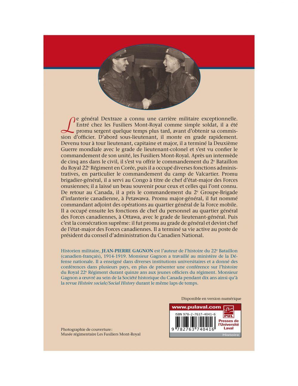 Le général Dextraze a connu une carrière militaire exceptionnelle. Entré chez les Fusiliers Mont-Royal comme simple soldat, il a été promu sergent quelque temps plus tard, avant d’obtenir sa commission d’officier. D’abord sous-lieutenant, il monte en grade rapidement. Devenu tour à tour lieutenant, capitaine et major, il a terminé la Deuxième Guerre mondiale avec le grade de lieutenant-colonel et s’est vu confier le commandement de son unité, les Fusiliers Mont-Royal. Après un intermède de cinq ans dans le civil, il s’est vu offrir le commandement du 2e Bataillon du Royal 22e Régiment en Corée, puis il a occupé diverses fonctions administratives, en particulier le commandement du camp de Valcartier. Promu brigadier-général, il a servi au Congo à titre de chef d’état-major des Forces onusiennes ; il a laissé un beau souvenir pour ceux et celles qui l’ont connu. De retour au Canada, il a pris le commandement du 2e Groupe-Brigade d’infanterie canadienne, à Petawawa. Promu major-général, il fut nommé commandant adjoint des opérations au quartier général de la Force mobile. Il a occupé ensuite les fonctions de chef du personnel au quartier général des Forces canadiennes, à Ottawa, avec le grade de lieutenant-général. Puis c’est la consécration suprême : il fut promu au grade de général et devint chef de l’état-major des Forces canadiennes. Il a terminé sa vie active au poste de président du conseil d’administration du Canadien National.