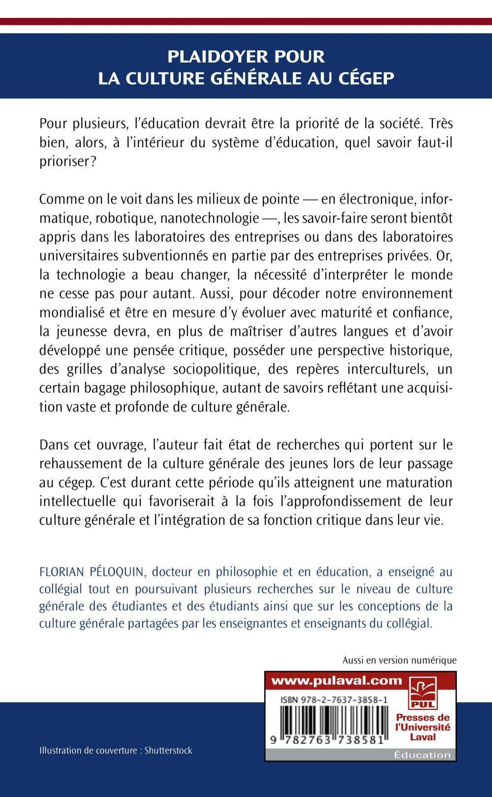 Pour plusieurs, l’éducation devrait être la priorité de la société. Très bien, alors, à l’intérieur du système d’éducation, quel savoir faut-il prioriser ? Comme on le voit dans les milieux de pointe — en électronique, informatique, robotique, nanotechnologie —, les savoir-faire seront bientôt appris dans les laboratoires des entreprises ou dans des laboratoires universitaires subventionnés en partie par des entreprises privées. Or, la technologie a beau changer, la nécessité d’interpréter le monde ne cesse pas pour autant. Aussi, pour décoder notre environnement mondialisé et être en mesure d’y évoluer avec maturité et confiance, la jeunesse devra, en plus de maîtriser d’autres langues et d’avoir développé une pensée critique, posséder une perspective historique, des grilles d’analyse sociopolitique, des repères interculturels, un certain bagage philosophique, autant de savoirs reflétant une acquisition vaste et profonde de culture générale.Dans cet ouvrage, l’auteur fait état de recherches qui portent sur le rehaussement de la culture générale des jeunes lors de leur passage au cégep. C’est durant cette période qu’ils atteignent une maturation intellectuelle qui favoriserait à la fois l’approfondissement de leur culture générale et l’intégration de sa fonction critique dans leur vie.