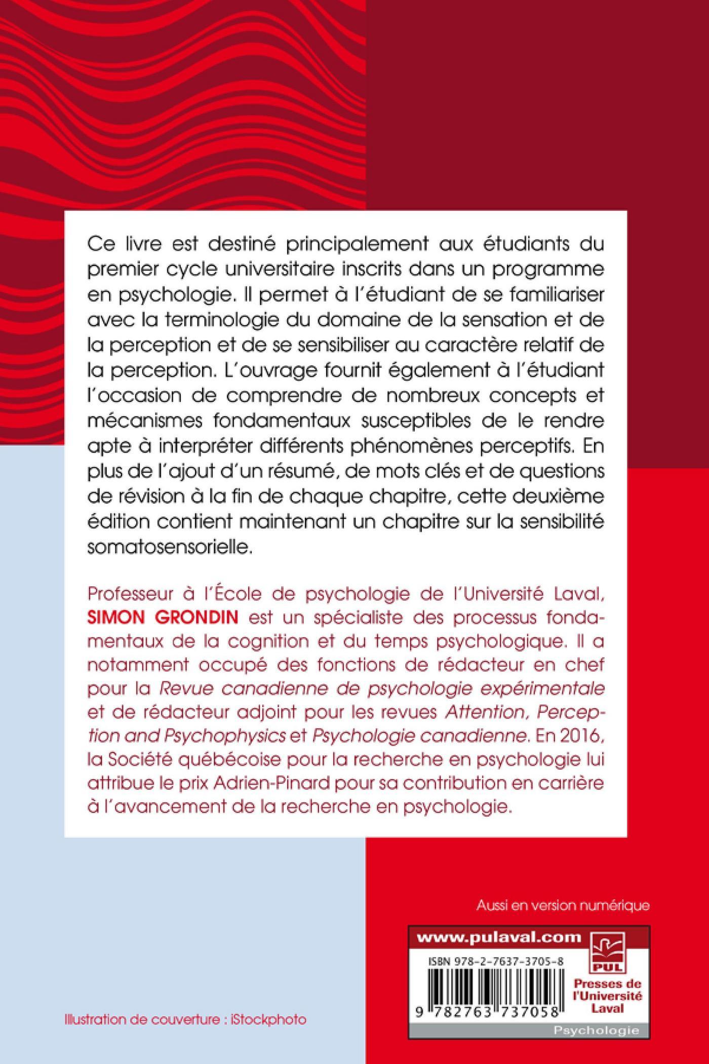 Ce livre est destiné principalement aux étudiants du premier cycle universitaire inscrits dans un programme en psychologie. Il permet à l’étudiant de se familiariser avec la terminologie du domaine de la sensation et de la perception et de se sensibiliser au caractère relatif de la perception. L’ouvrage fournit également à l’étudiant l’occasion de comprendre de nombreux concepts et mécanismes fondamentaux susceptibles de le rendre apte à interpréter différents phénomènes perceptifs. En plus de l’ajout d’un résumé, de mots clés et de questions de révision à la fin de chaque chapitre, cette deuxième édition contient un chapitre sur la sensibilité somatosensorielle.