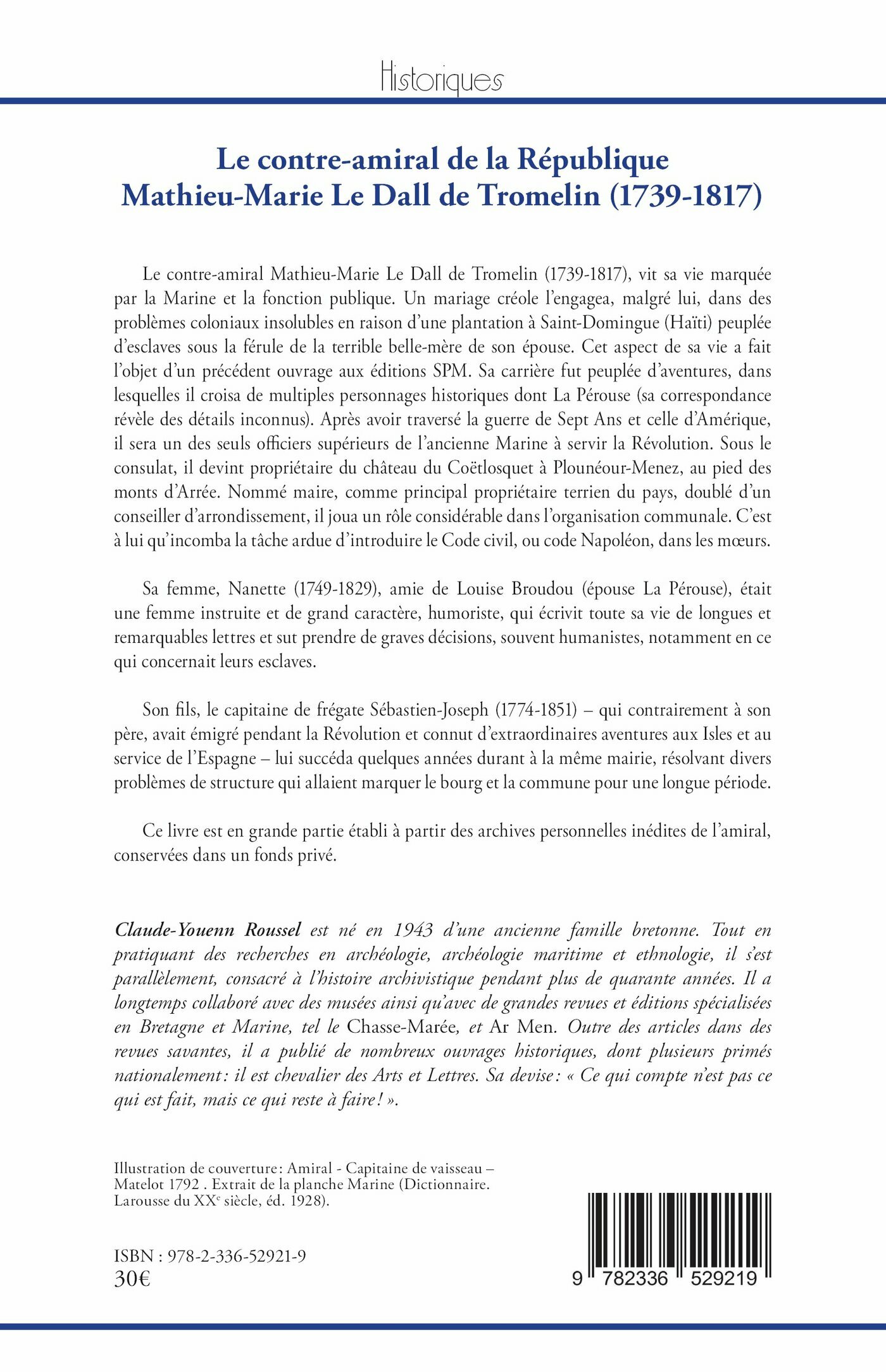 Le contre-amiral Mathieu-Marie Le Dall de Tromelin (1739-1817), vit sa vie marquée par la Marine et la fonction publique. Un mariage créole l’engagea, malgré lui, dans des problèmes coloniaux insolubles en raison d’une plantation à Saint-Domingue (Haïti) peuplée d’esclaves sous la férule de la terrible belle-mère de son épouse. Cet aspect de sa vie a fait l’objet d’un précédent ouvrage aux éditions SPM. Sa carrière fut peuplée d’aventures, dans lesquelles il croisa de multiples personnages historiques dont La Pérouse (sa correspondance révèle des détails inconnus). Après avoir traversé la guerre de Sept Ans et celle d’Amérique, il sera un des seuls officiers supérieurs de l’ancienne Marine à servir la Révolution. Sous le consulat, il devint propriétaire du château du Coëtlosquet à Plounéour-Menez, au pied des monts d’Arrée. Nommé maire, comme principal propriétaire terrien du pays, doublé d’un conseiller d’arrondissement, il joua un rôle considérable dans l’organisation communale. C’est à lui qu’incomba la tâche ardue d’introduire le Code civil, ou code Napoléon, dans les mœurs.