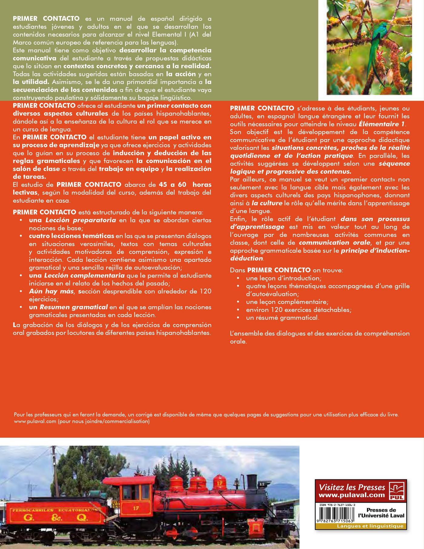 PRIMER CONTACTO s’adresse à des étudiants, jeunes ou adultes, en espagnol langue étrangère et leur fournit les outils nécessaires pour atteindre le niveau Élémentaire 1. Son objectif est le développement de la compétence communicative de l’étudiant par une approche didactique valorisant les situations concrètes, proches de la réalité quotidienne et de l’action pratique. En parallèle, les activités suggérées se développent selon une séquence logique et progressive des contenus.Par ailleurs, ce manuel se veut un «premier contact» non seulement avec la langue cible mais également avec les divers aspects culturels des pays hispanophones, donnant ainsi à la culture le rôle qu’elle mérite dans l’apprentissage d’une langue. Enfin, le rôle actif de l’étudiant dans son processus d’apprentissage est mis en valeur tout au long de l’ouvrage, par de nombreuses activités communes en classe, dont celle de communication orale, et par une approche grammaticale basée sur le principe d’induction déduction.Dans PRIMER CONTACTO on trouve:• une leçon d’introduction• quatre leçons thématiques accompagnées d’une grille d’autoévaluation• une leçon complémentaire• environ 130 exercices détachables• Un résumé gramaticalLe matériel inclut un lien de téléchargement comprenant tous les dialogues et les exercices de compréhension orale.Un corrigé est disponible pour les professeurs qui en feront la demande.