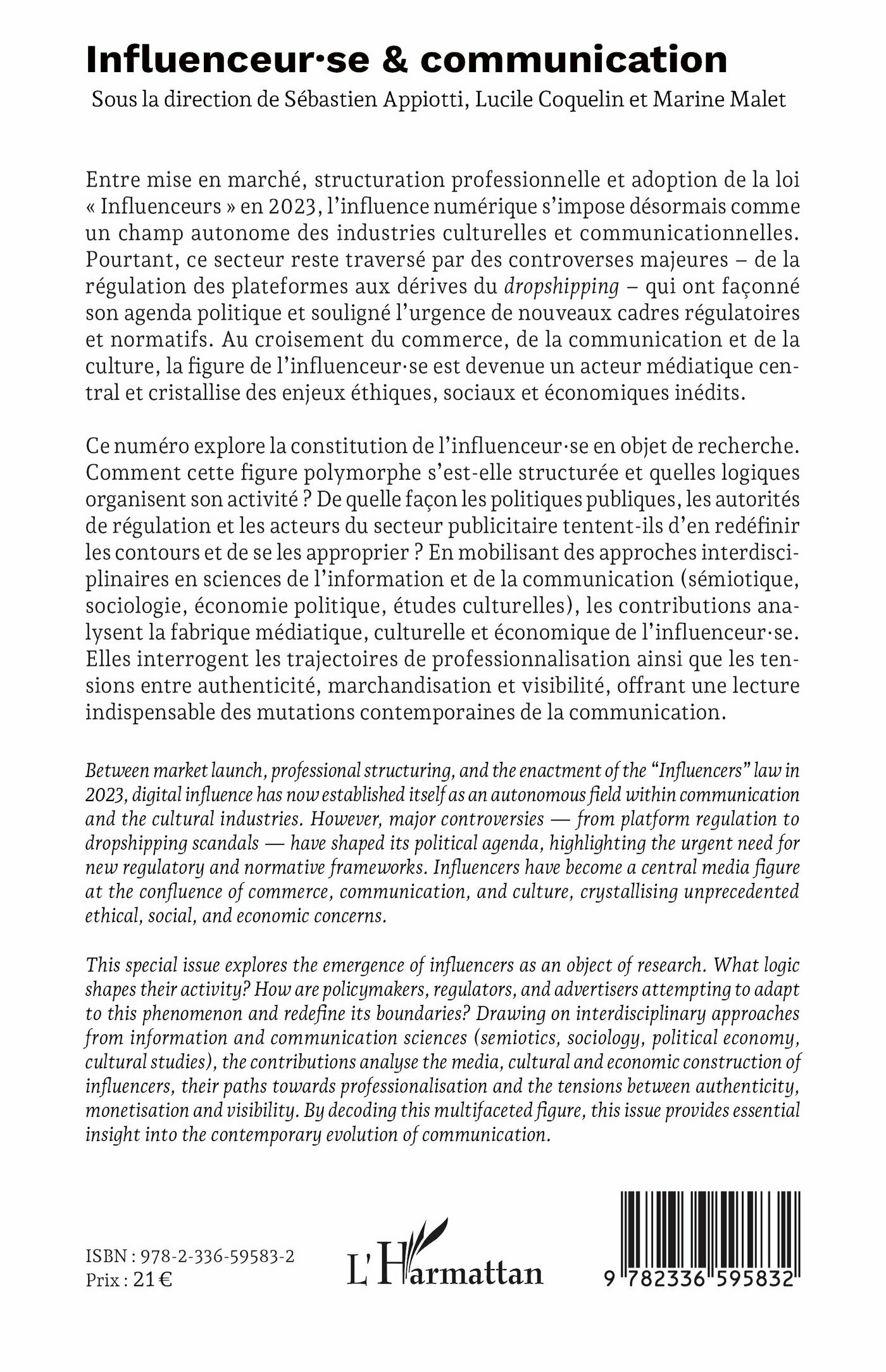 Between market launch, professional structuring, and the enactment of the "Influencers" law in 2023, digital influence has now established itself as an autonomous field within communication and the cultural industries. However, major controversies from platform regulation to dropshipping scandals have shaped its political agenda, highlighting the urgent need for new regulatory and normative frameworks. Influencers have become a central media figure at the confluence of commerce, communication, and culture, crystallising unprecedented ethical, social, and economic concerns.