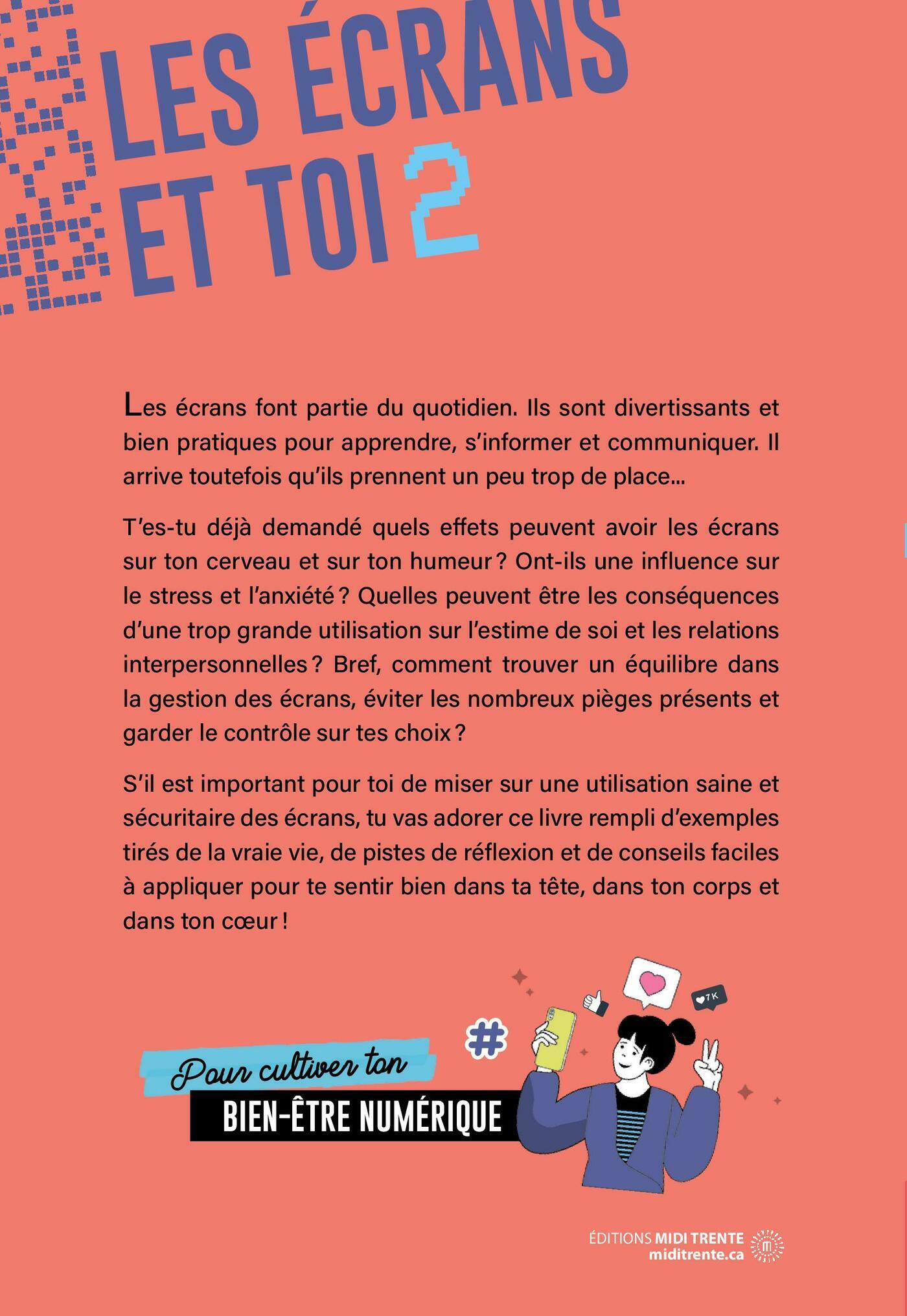 Les écrans font partie du quotidien. Ils sont divertissants et bien pratiques pour apprendre, s’informer et communiquer. Il arrive toutefois qu’ils prennent un peu trop de place...T’es-tu déjà demandé quels effets peuvent avoir les écrans sur ton cerveau et sur ton humeur ? Ont-ils une influence sur le stress et l’anxiété ? Quelles peuvent être les conséquences d’une trop grande utilisation sur l’estime de soi et les relations interpersonnelles ? Bref, comment trouver un équilibre dans la gestion des écrans, éviter les nombreux pièges présents et garder le contrôle sur tes choix ?S’il est important pour toi de miser sur une utilisation saine et sécuritaire des écrans, tu vas adorer ce livre rempli d’exemples tirés de la vraie vie, de pistes de réflexion et de conseils faciles à appliquer pour te sentir bien dans ta tête, dans ton corps et dans ton cœur !